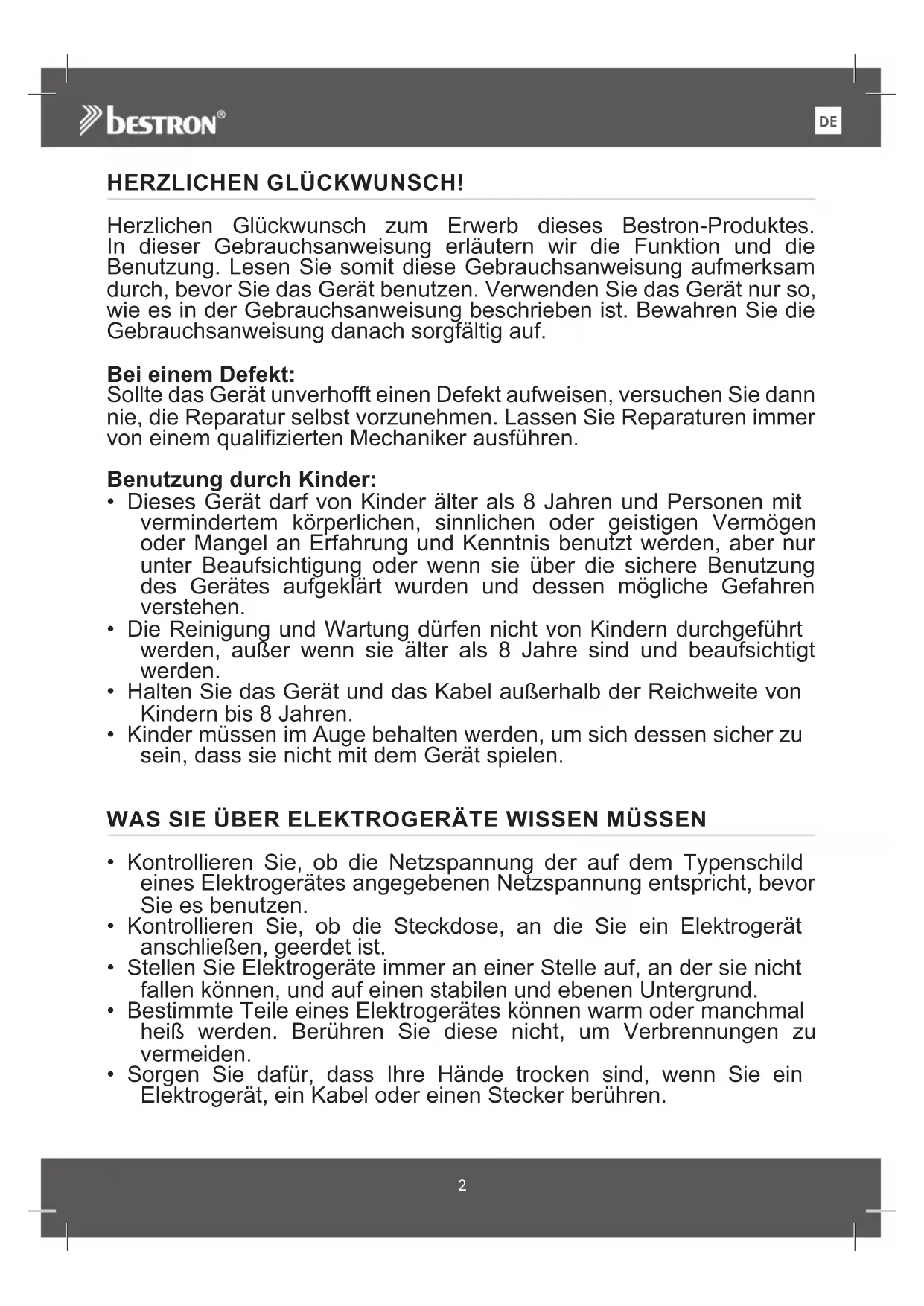 VoltsHERZLICHEN GLÜCKWUNSCH! Herzlichen Glückwunsch zum Erwerb dieses Bestron-Produktes. In dieser Gebrauchsanweisung erläutern wir die Funktion und die Benutzung. Lesen Sie somit diese Gebrauchsanweisung aufmerksam durch, bevor Sie das Gerät benutzen. Verwenden Sie das Gerät nur so, wie es in der Gebrauchsanweisung beschrieben ist. Bewahren Sie die Gebrauchsanweisung danach sorgfältig auf. Bei einem Defekt: Sollte das Gerät unverhofft einen Defekt aufweisen, versuchen Sie dann nie, die Reparatur selbst vorzunehmen. Lassen Sie Reparaturen immer von einem qualifizierten Mechaniker ausführen. Benutzung durch Kinder: