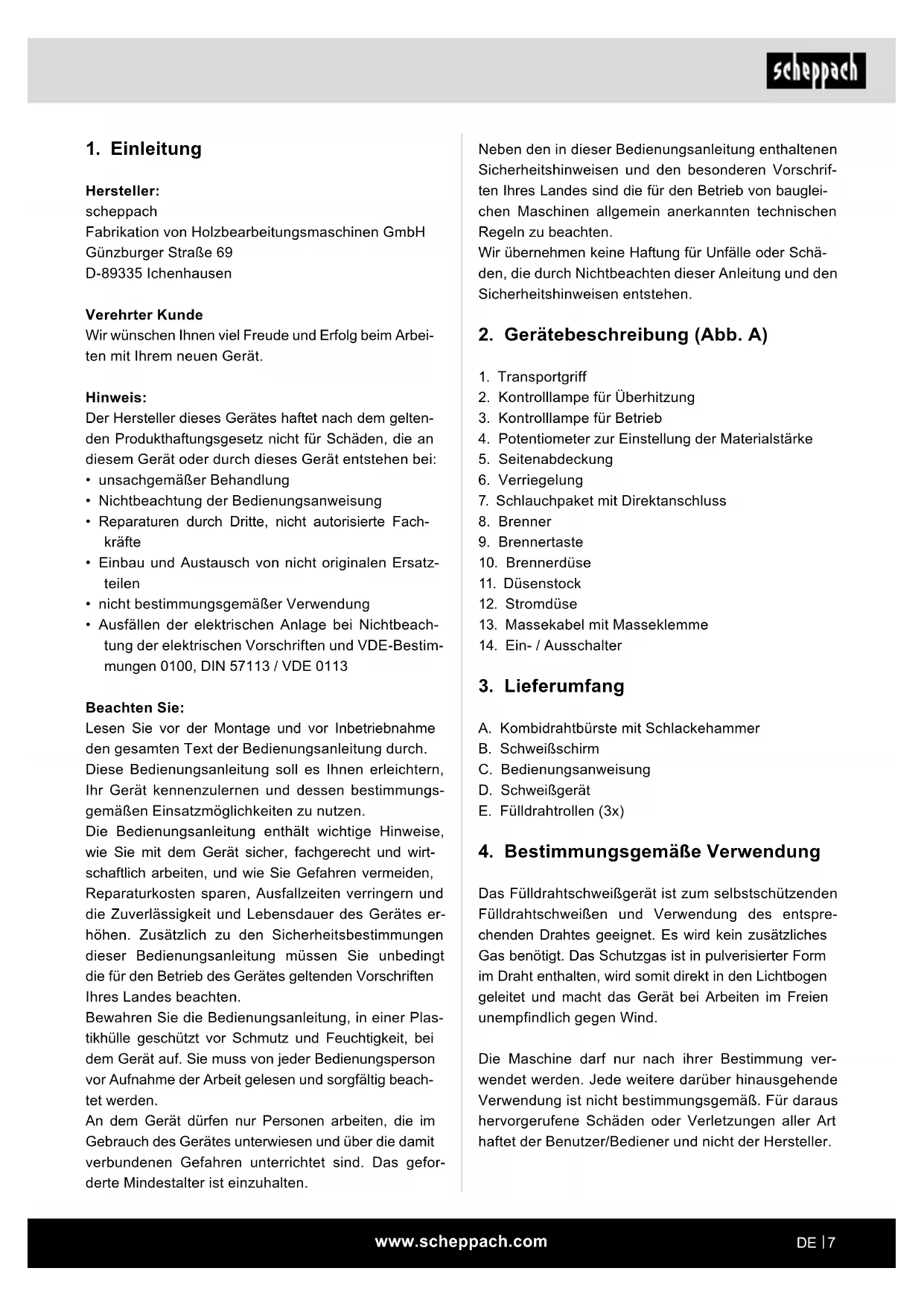 Das Fülldrahtschweißgerät ist zum selbstschützenden Fülldrahtschweißen und Verwendung des entspre- chenden Drahtes geeignet. Es wird kein zusätzliches Gas benötigt. Das Schutzgas ist in pulverisierter Form im Draht enthalten, wird somit direkt in den Lichtbogen geleitet und macht das Gerät bei Arbeiten im Freien unempfindlich gegen Wind. Die Maschine darf nur nach ihrer Bestimmung ver- wendet werden. Jede weitere darüber hinausgehende Verwendung ist nicht bestimmungsgemäß. Für daraus hervorgerufene Schäden oder Verletzungen aller Art haftet der Benutzer/Bediener und nicht der Hersteller.www.scheppach.com