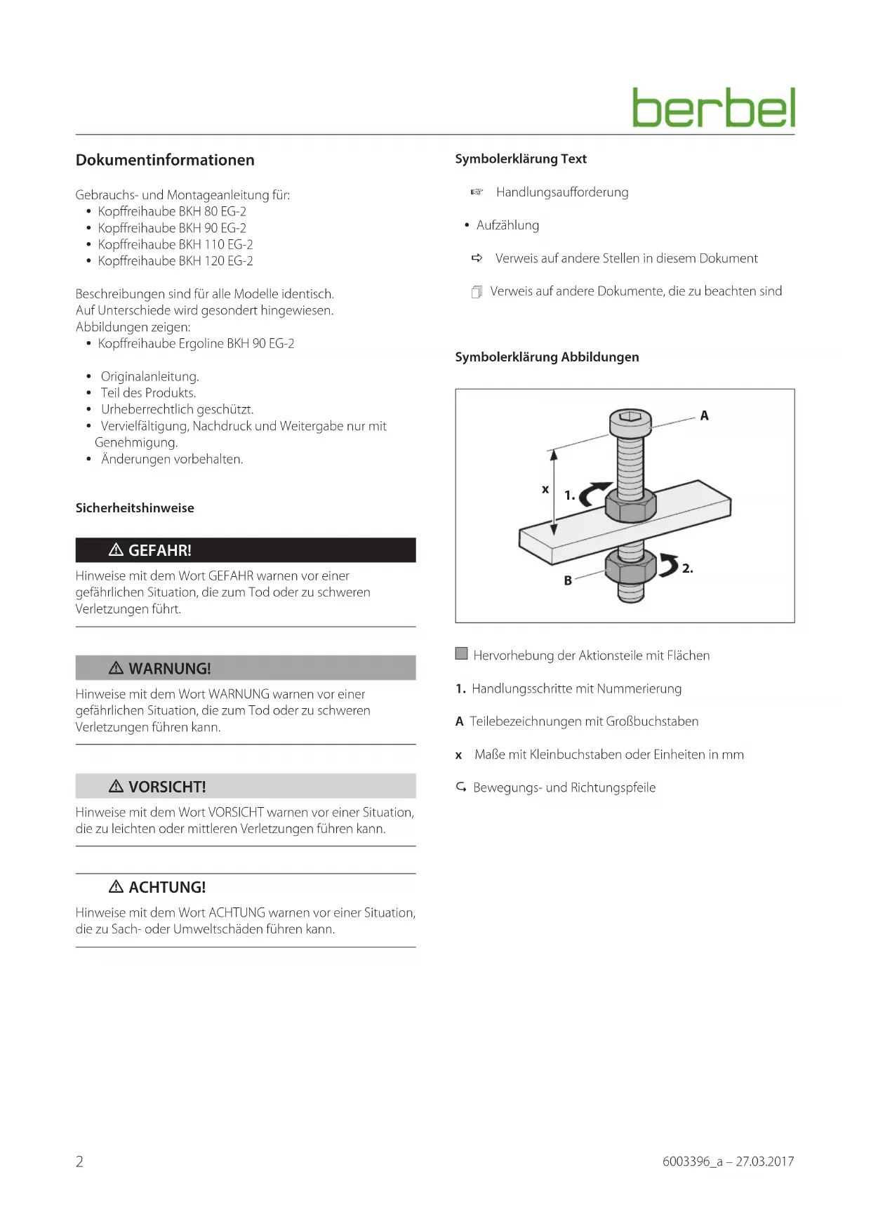 Operating and installation instructions for the models BKH 80 EG-2 BKH 90 EG-2 BKH 110 EG-2 BKH 120 EG-2 6003396_a2 6003396_a – 27.03.2017 Dokumentinformationen Gebrauchs- und Montageanleitung für: y Kopffreihaube BKH 80 EG-2 y Kopffreihaube BKH 90 EG-2 y Kopffreihaube BKH 110 EG-2 y Kopffreihaube BKH 120 EG-2 Beschreibungen sind für alle Modelle identisch. Auf Unterschiede wird gesondert hingewiesen. Abbildungen zeigen: y Kopffreihaube Ergoline BKH 90 EG-2 y Originalanleitung. y Teil des Produkts. y Urheberrechtlich geschützt. y Vervielfältigung, Nachdruck und Weitergabe nur mit Genehmigung. y Änderungen vorbehalten. Sicherheitshinweise m GEFAHR! Hinweise mit dem Wort GEFAHR warnen vor einer gefährlichen Situation, die zum Tod oder zu schweren Verletzungen führt. m WARNUNG! Hinweise mit dem Wort WARNUNG warnen vor einer gefährlichen Situation, die zum Tod oder zu schweren Verletzungen führen kann. m VORSICHT! Hinweise mit dem Wort VORSICHT warnen vor einer Situation, die zu leichten oder mittleren Verletzungen führen kann. m ACHTUNG! Hinweise mit dem Wort ACHTUNG warnen vor einer Situation, die zu Sach- oder Umweltschäden führen kann. Symbolerklärung Text Handlungsaufforderung y Aufzählung D Verweis auf andere Stellen in diesem Dokument Verweis auf andere Dokumente, die zu beachten sind Symbolerklärung Abbildungen