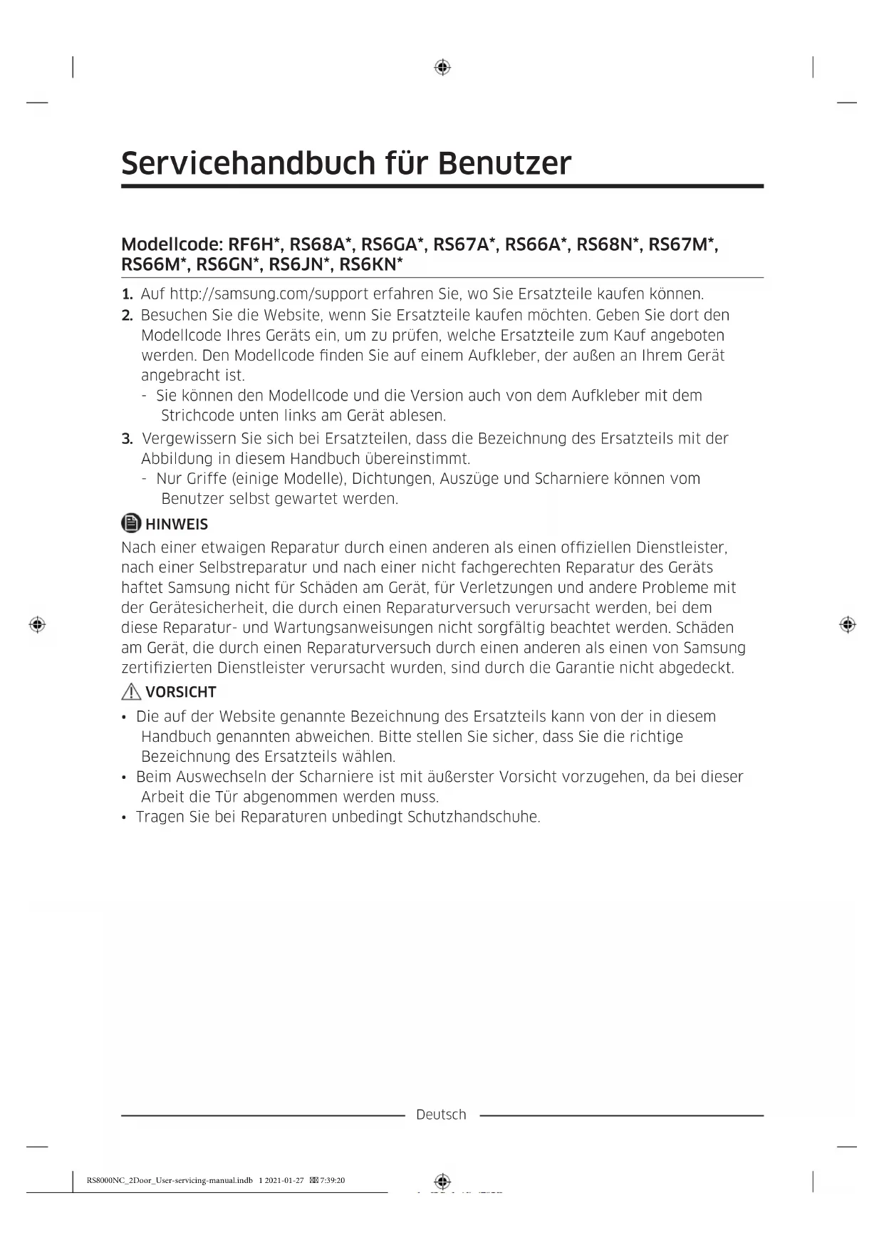 - Tragen Sie bei Reparaturen unbedingt Schutzhandschuhe. RS8000NC_2Door_User-servicing-manual.indb 1 2021-01-27 7:39:20Deutsch Das tatsächliche Aussehen und die mitgelieferten Teile der Kühl-/Gefrierkombination können sich je nach Modell und Land unterscheiden.