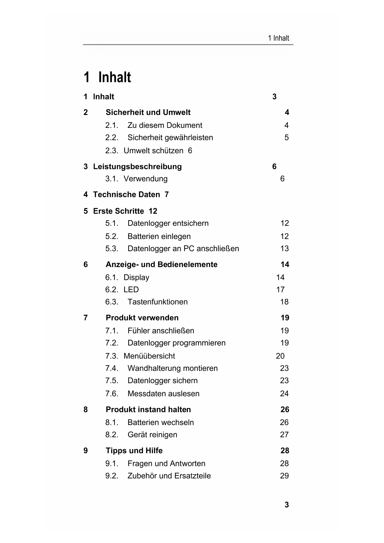 Pos: 2 /TD/Überschr iften/1. Inhalt @ 0\mod_1 177587817070_6.doc @ 1241 @ 1 1 Inhalt 1 Inhalt 3 2 Sicherheit und Umwelt 4 2.1. Zu diesem Dokument 4 2.2. Sicherheit gewährleisten 5 2.3. Umwelt schützen 6 3 Leistungsbeschreibung 6 3.1. Verwendung 6 4 Technische Daten 7 5 Erste Schritte 12 5.1. Datenlogger entsichern 12 5.2. Batterien einlegen 12 5.3. Datenlogger an PC anschließen 13 6 Anzeige- und Bedienelemente 14 6.1. Display 14 6.2. LED 17 6.3. Tastenfunktionen 18 7 Produkt verwenden 19 7.1. Fühler anschließen 19 7.2. Datenlogger programmieren 19 7.3. Menüübersicht 20 7.4. Wandhalterung montieren 23 7.5. Datenlogger sichern 23 7.6. Messdaten auslesen 24 8 Produkt instand halten 26 8.1. Batterien wechseln 26 8.2. Gerät reinigen 27 9 Tipps und Hilfe 28 9.1. Fragen und Antworten 28 9.2. Zubehör und Ersatzteile 292 Sicherheit und Umwelt