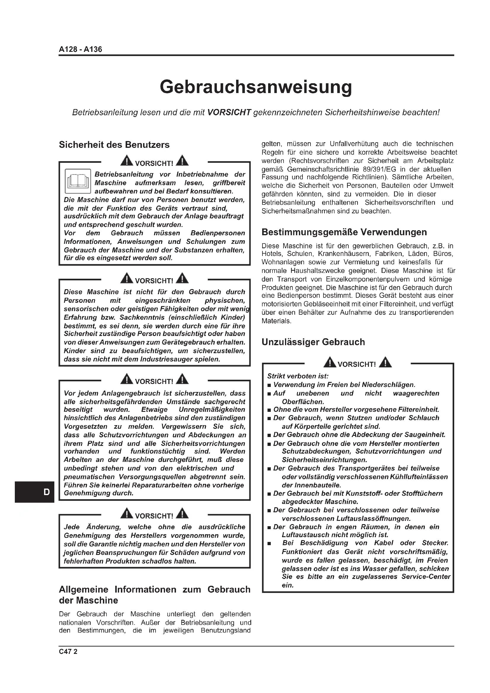 Gebrauchsanweisung gelten, müssen zur Unfallverhütung auch die technischen Regeln für eine sichere und korrekte Arbeitsweise beachtet werden (Rechtsvorschriften zur Sicherheit am Arbeitsplatz gemäß Gemeinschaftsrichtlinie 89/391/EG in der aktuellen Fassung und nachfolgende Richtlinien). Sämtliche Arbeiten, welche die Sicherheit von Personen, Bauteilen oder Umwelt gefährden könnten, sind zu vermeiden. Die in dieser Betriebsanleitung enthaltenen Sicherheitsvorschriften und Sicherheitsmaßnahmen sind zu beachten. Bestimmungsgemäße Verwendungen Diese Maschine ist für den gewerblichen Gebrauch, z.B. in Hotels, Schulen, Krankenhäusern, Fabriken, Läden, Büros, Wohnanlagen sowie zur Vermietung und keinesfalls für normale Haushaltszwecke geeignet. Diese Maschine ist für den Transport von Einzelkomponentenpulvern und körnige Produkten geeignet. Die Maschine ist für den Gebrauch durch eine Bedienperson bestimmt. Dieses Gerät besteht aus einer motorisierten Gebläseeinheit mit einer Filtereinheit, und verfügt über einen Behälter zur Aufnahme des zu transportierenden Materials. Unzulässiger Gebrauch VORSICHT! Strikt verboten ist: ■ Verwendung im Freien bei Niederschlägen. ■ Auf unebenen und nicht waagerechten Oberächen. ■ Ohne die vom Hersteller vorgesehene Filtereinheit. ■ Der Gebrauch, wenn Stutzen und/oder Schlauch auf Körperteile gerichtet sind. ■ Der Gebrauch ohne die Abdeckung der Saugeinheit. ■ Der Gebrauch ohne die vom Hersteller montierten Schutzabdeckungen, Schutzvorrichtungen und Sicherheitseinrichtungen. ■ Der Gebrauch des Transportgerätes bei teilweise oder vollständig verschlossenen Kühllufteinlässen der Innenbauteile. ■ Der Gebrauch bei mit Kunststo- oder Stotüchern abgedeckter Maschine. ■ Der Gebrauch bei verschlossenen oder teilweise verschlossenen Luftauslassönungen. ■ Der Gebrauch in engen Räumen, in denen ein Luftaustausch nicht möglich ist. ■ Bei Beschädigung von Kabel oder Stecker. Funktioniert das Gerät nicht vorschriftsmäßig, wurde es fallen gelassen, beschädigt, im Freien gelassen oder ist es ins Wasser gefallen, schicken Sie es bitte an ein zugelassenes Service-Center ein. Betriebsanleitung lesen und die mit VORSICHT gekennzeichneten Sicherheitshinweise beachten! Sicherheit des Benutzers VORSICHT! Betriebsanleitung vor Inbetriebnahme der Maschine aufmerksam lesen, gribereit aufbewahren und bei Bedarf konsultieren. Die Maschine darf nur von Personen benutzt werden, die mit der Funktion des Geräts vertraut sind, ausdrücklich mit dem Gebrauch der Anlage beauftragt und entsprechend geschult wurden. Vor dem Gebrauch müssen Bedienpersonen Informationen, Anweisungen und Schulungen zum Gebrauch der Maschine und der Substanzen erhalten, für die es eingesetzt werden soll. VORSICHT! Diese Maschine ist nicht für den Gebrauch durch Personen mit eingeschränkten physischen, sensorischen oder geistigen Fähigkeiten oder mit wenig Erfahrung bzw. Sachkenntnis (einschließlich Kinder) bestimmt, es sei denn, sie werden durch eine für ihre Sicherheit zuständige Person beaufsichtigt oder haben von dieser Anweisungen zum Gerätegebrauch erhalten. Kinder sind zu beaufsichtigen, um sicherzustellen, dass sie nicht mit dem Industriesauger spielen. VORSICHT! Vor jedem Anlagengebrauch ist sicherzustellen, dass alle sicherheitsgefährdenden Umstände sachgerecht beseitigt wurden. Etwaige Unregelmäßigkeiten hinsichtlich des Anlagenbetriebs sind den zuständigen Vorgesetzten zu melden. Vergewissern Sie sich, dass alle Schutzvorrichtungen und Abdeckungen an ihrem Platz sind und alle Sicherheitsvorrichtungen vorhanden und funktionstüchtig sind. Werden Arbeiten an der Maschine durchgeführt, muß diese unbedingt stehen und von den elektrischen und pneumatischen Versorgungsquellen abgetrennt sein. Führen Sie keinerlei Reparaturarbeiten ohne vorherige Genehmigung durch. VORSICHT! Jede Änderung, welche ohne die ausdrückliche Genehmigung des Herstellers vorgenommen wurde, soll die Garantie nichtig machen und den Hersteller von jeglichen Beanspruchungen für Schäden aufgrund von fehlerhaften Produkten schadlos halten. Allgemeine Informationen zum Gebrauch der Maschine Der Gebrauch der Maschine unterliegt den geltenden nationalen Vorschriften. Außer der Betriebsanleitung und den Bestimmungen, die im jeweiligen BenutzungslandA128 - A136 3 C47