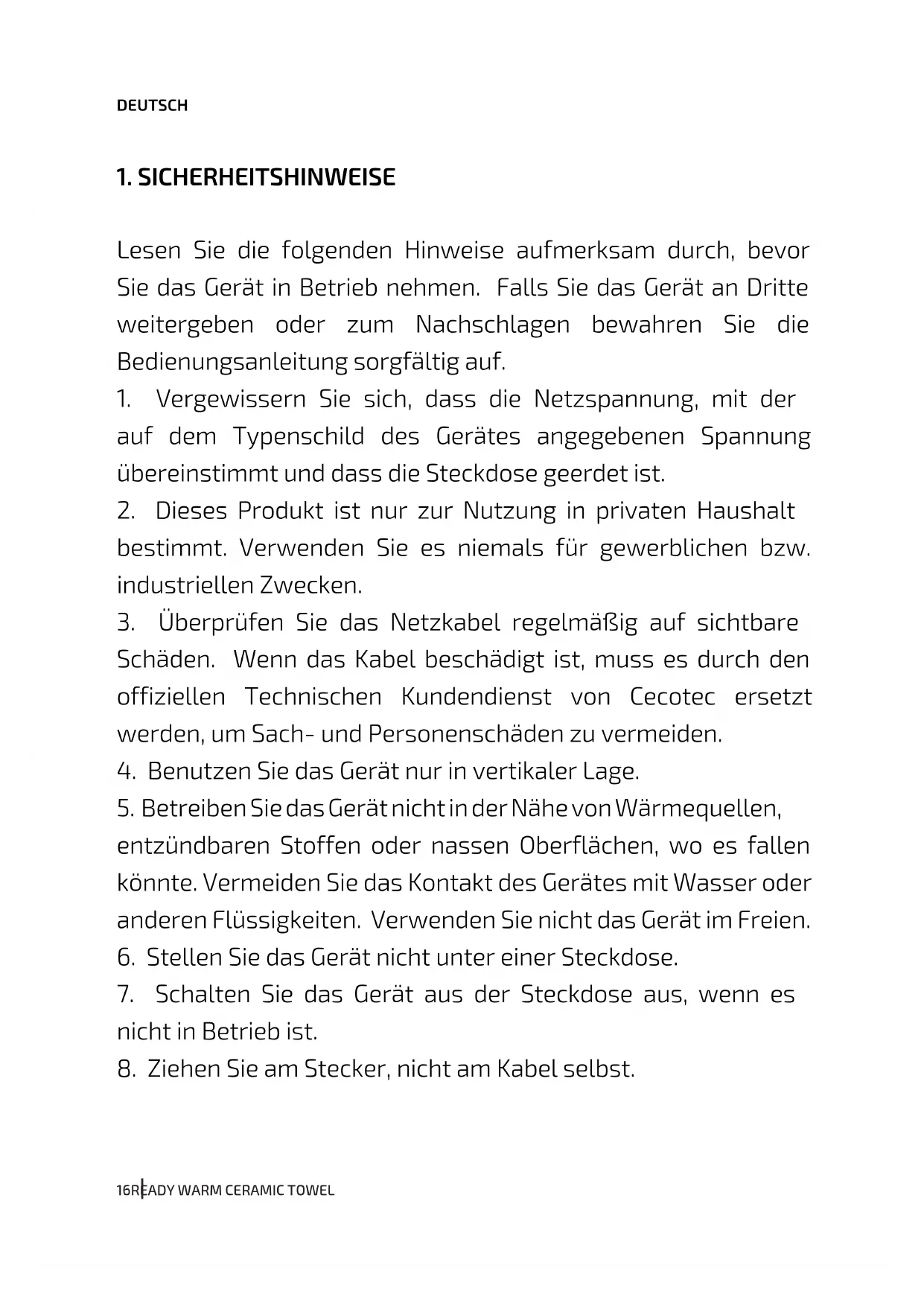 BEDIENUNGSANLEITUNG Ready Warm 9780 Ceramic Towel CECOTEC