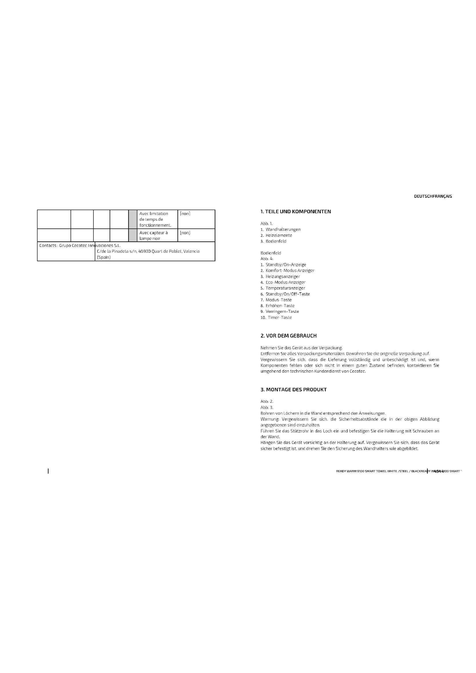 Finden Sie kostenlos die Bedienungsanleitung des Geräts ReadyWarm 9100 Smart Towel CECOTEC als PDF.