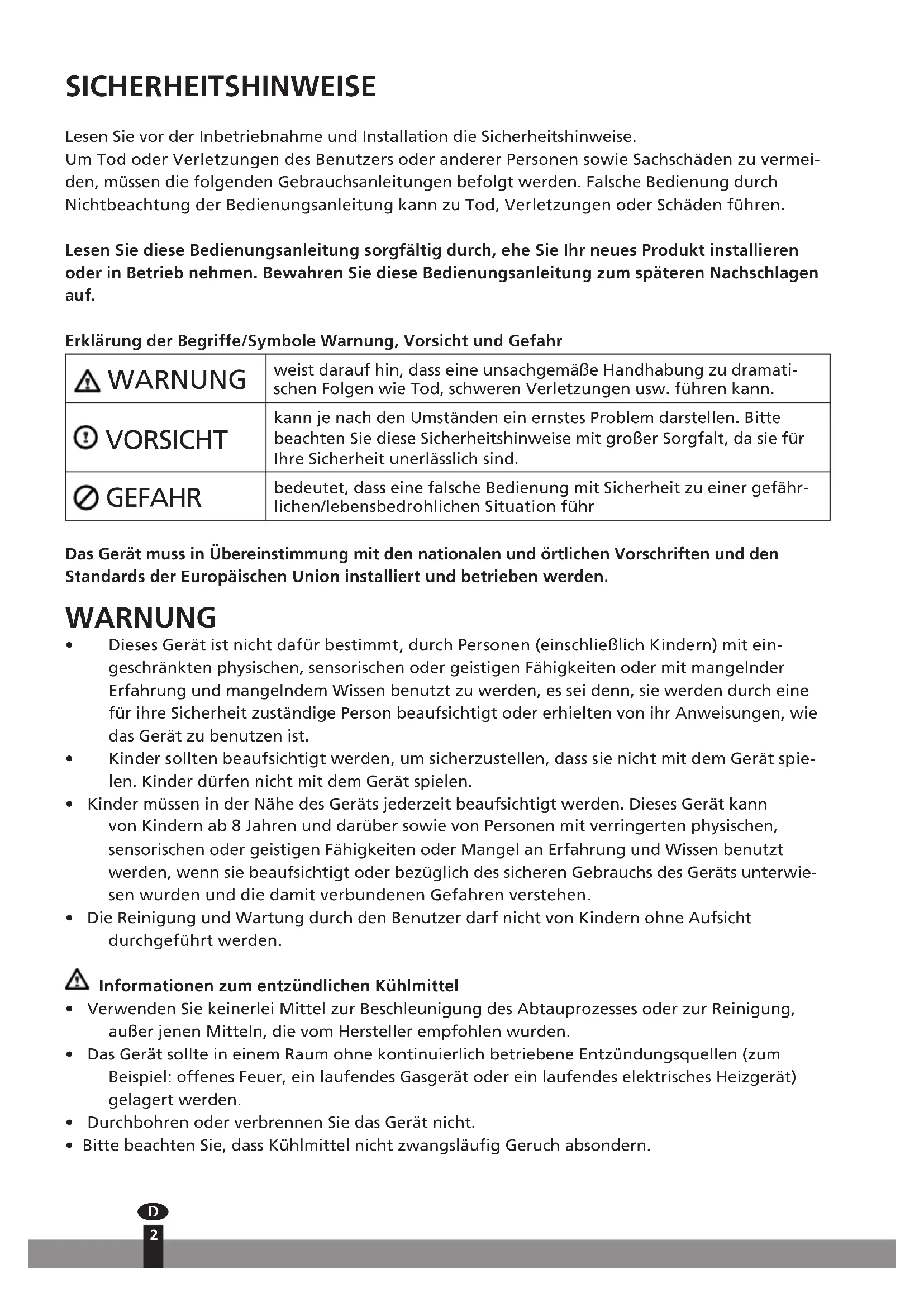 SICHERHEITSHINWEISE Lesen Sie vor der Inbetriebnahme und Installation die Sicherheitshinweise. Um Tod oder Verletzungen des Benutzers oder anderer Personen sowie Sachschäden zu vermei- den, müssen die folgenden Gebrauchsanleitungen befolgt werden. Falsche Bedienung durch Nichtbeachtung der Bedienungsanleitung kann zu Tod, Verletzungen oder Schäden führen. Lesen Sie diese Bedienungsanleitung sorgfältig durch, ehe Sie Ihr neues Produkt installieren oder in Betrieb nehmen. Bewahren Sie diese Bedienungsanleitung zum späteren Nachschlagen auf. Erklärung der Begriffe/Symbole Warnung, Vorsicht und Gefahr WARNUNG weist darauf hin, dass eine unsachgemäße Handhabung zu dramati- schen Folgen wie Tod, schweren Verletzungen usw. führen kann. VORSICHT kann je nach den Umständen ein ernstes Problem darstellen. Bitte beachten Sie diese Sicherheitshinweise mit großer Sorgfalt, da sie für Ihre Sicherheit unerlässlich sind. GEFAHR bedeutet, dass eine falsche Bedienung mit Sicherheit zu einer gefähr- lichen/lebensbedrohlichen Situation führ Das Gerät muss in Übereinstimmung mit den nationalen und örtlichen Vorschriften und den Standards der Europäischen Union installiert und betrieben werden. WARNUNG