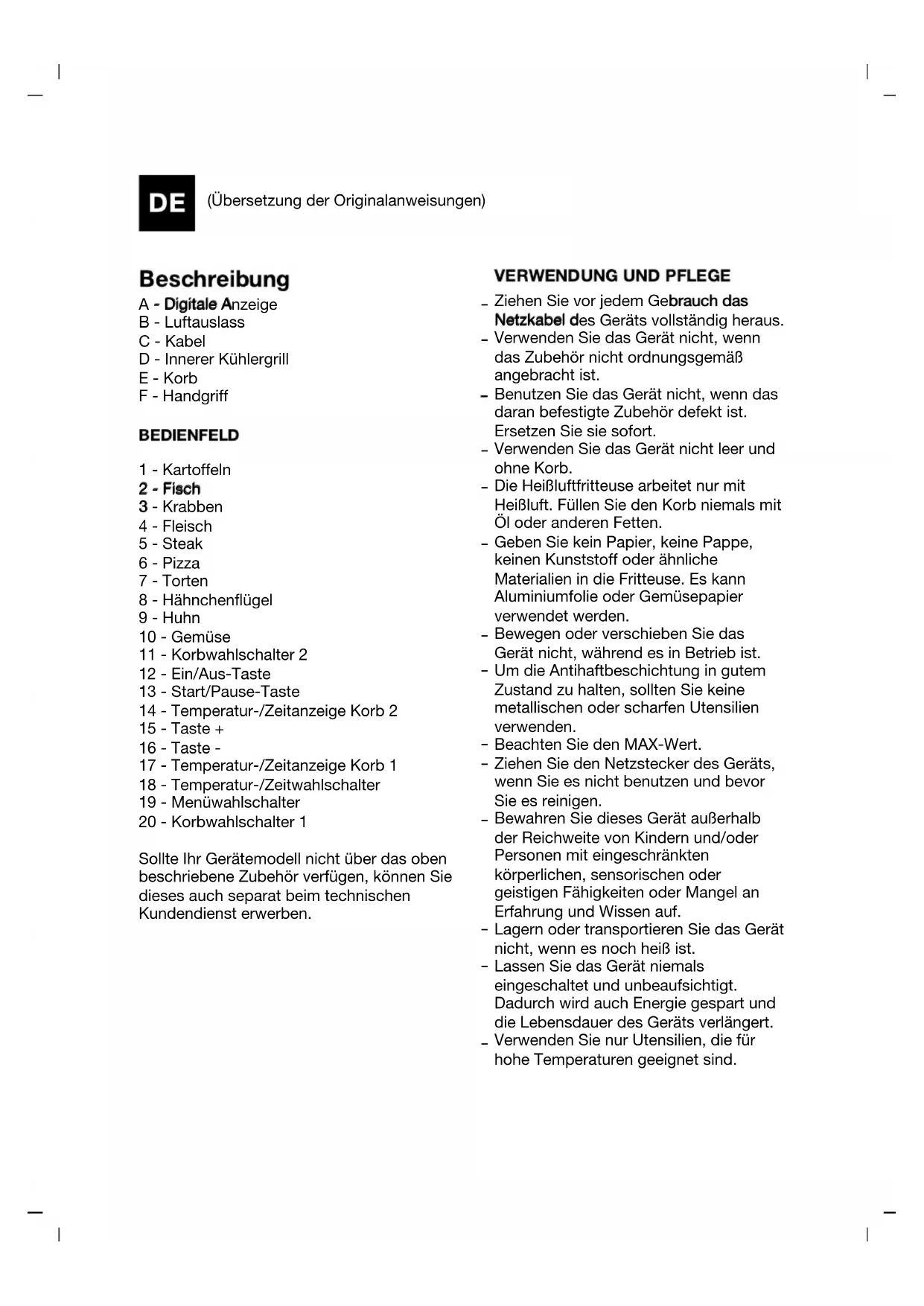 Ziehen Sie vor jedem Gebrauch das Netzkabel des Geräts vollständig heraus. Verwenden Sie das Gerät nicht, wenn das Zubehör nicht ordnungsgemäß angebracht ist. Benutzen Sie das Gerät nicht, wenn das daran befestigte Zubehör defekt ist. Ersetzen Sie sie sofort. Verwenden Sie das Gerät nicht leer und ohne Korb. Die Heißluftfritteuse arbeitet nur mit Heißluft. Füllen Sie den Korb niemals mit Öl oder anderen Fetten. Geben Sie kein Papier, keine Pappe, keinen Kunststoff oder ähnliche Materialien in die Fritteuse. Es kann Aluminiumfolie oder Gemüsepapier verwendet werden. Bewegen oder verschieben Sie das Gerät nicht, während es in Betrieb ist. Um die Antihaftbeschichtung in gutem Zustand zu halten, sollten Sie keine metallischen oder scharfen Utensilien verwenden. Beachten Sie den MAX-Wert. Ziehen Sie den Netzstecker des Geräts, wenn Sie es nicht benutzen und bevor Sie es reinigen. Bewahren Sie dieses Gerät außerhalb der Reichweite von Kindern und/oder Personen mit eingeschränkten körperlichen, sensorischen oder geistigen Fähigkeiten oder Mangel an Erfahrung und Wissen auf. Lagern oder transportieren Sie das Gerät nicht, wenn es noch heiß ist. Lassen Sie das Gerät niemals eingeschaltet und unbeaufsichtigt. Dadurch wird auch Energie gespart und die Lebensdauer des Geräts verlängert. Verwenden Sie nur Utensilien, die für hohe Temperaturen geeignet sind.