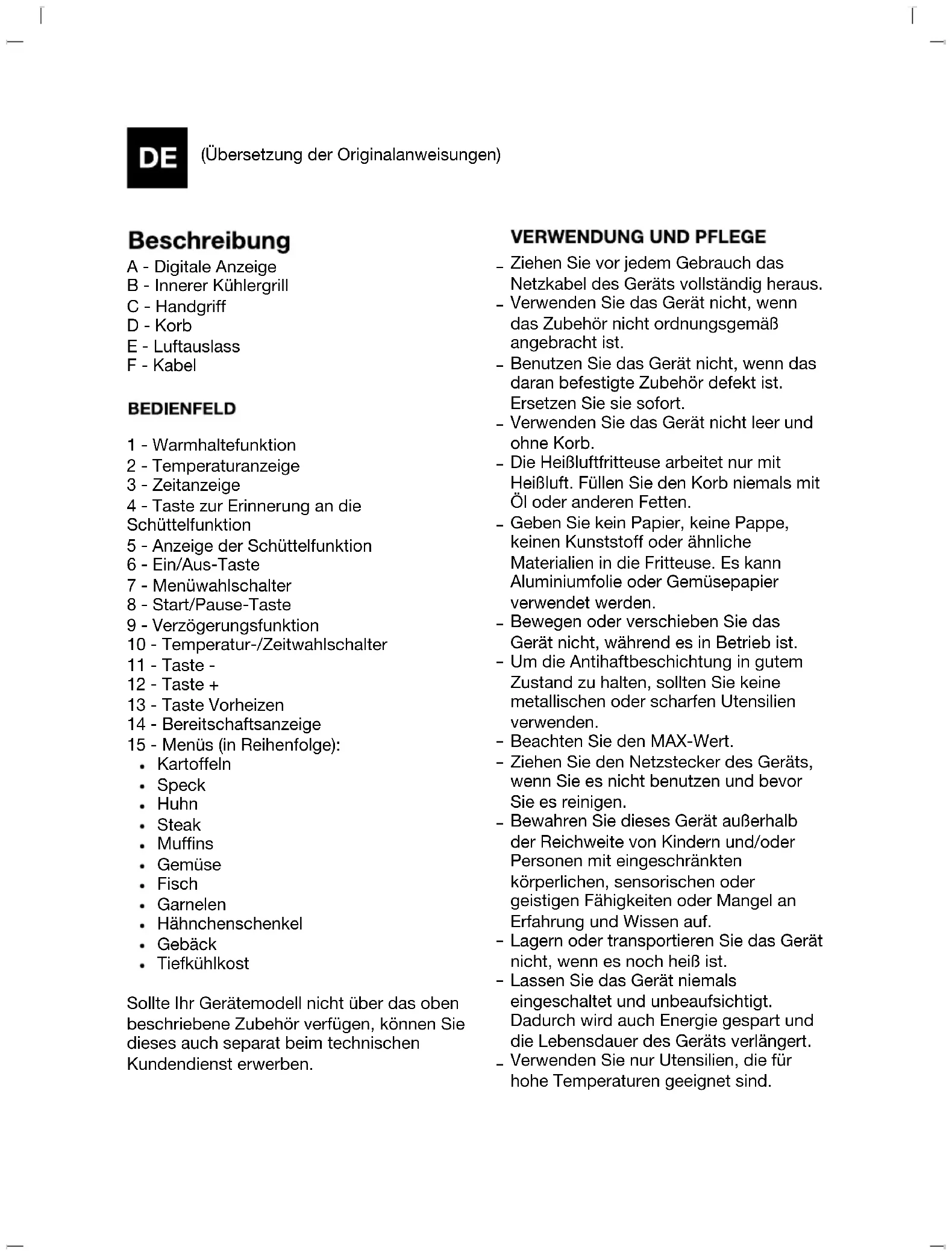 (Übersetzung der Originalanweisungen) Kartoffeln Speck Huhn Steak Muffins Gemüse Fisch Garnelen Hähnchenschenkel Gebäck Tiefkühlkost A - Digitale Anzeige B - Innerer Kühlergrill C - Handgriff D - Korb E - Luftauslass F - Kabel