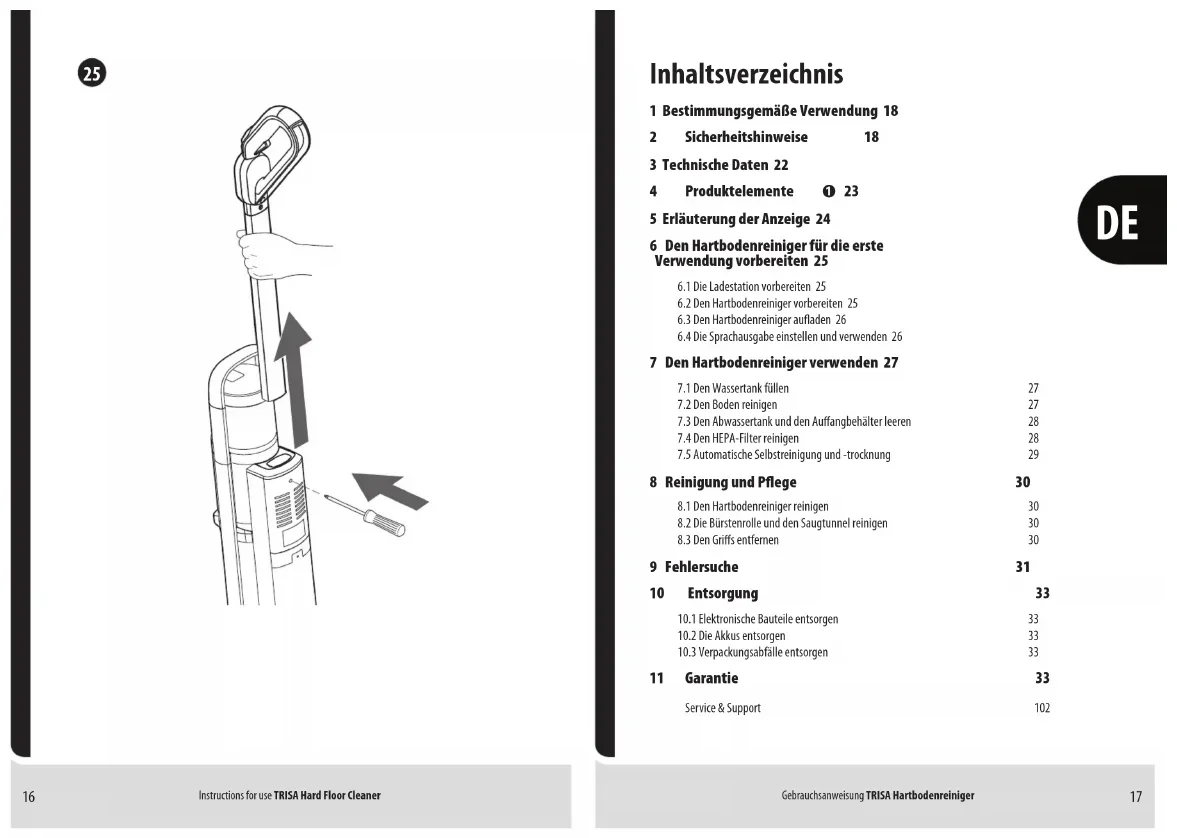 11 Garantie 33 Service & Support 102 Trisa_HardFloorCleaner - INDD - Second Draft.indd 16-17Trisa_HardFloorCleaner - INDD - Second Draft.indd 16-17 29-11-2022 01:04:4429-11-2022 01:04:4418 19 Gebrauchsanweisung TRISA Hartbodenreiniger Gebrauchsanweisung TRISA Hartbodenreiniger