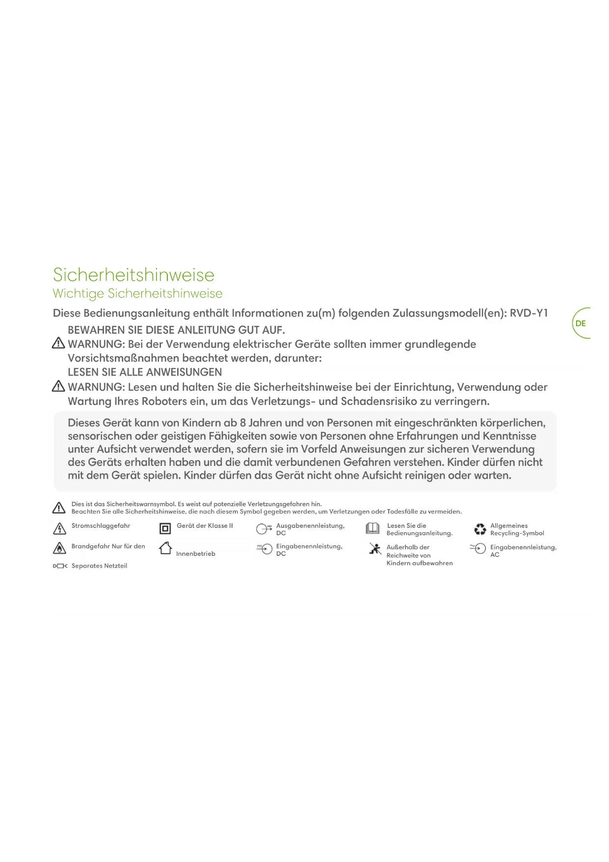 - Laden Sie Ihren Roboter nur mit dem mitgelieferten Netzteil auf. Das mitgelieferte Netzteil liefert eine Sicherheitskleinspannung, die der ALLGEMEIN WARNUNG