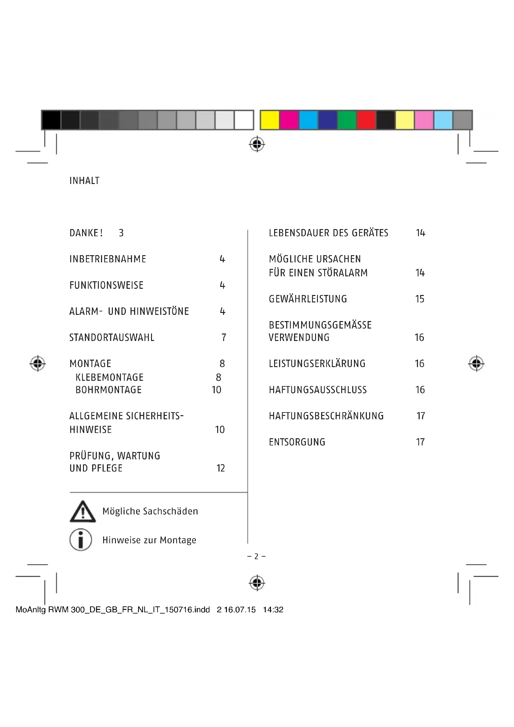 MoAnltg RWM 300_DE_GB_FR_NL_IT_150716.indd 13 16.07.15 14:32– 14 – – 15 – vorliegt, wird der Rauchwarnmelder nach Ermessen des Gewährleistung- gebers repariert oder ersetzt.