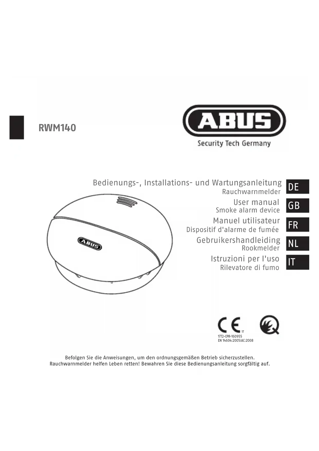RWM140 User manual Smoke alarm device Manuel utilisateur Dispositif d'alarme de fumée Gebruikershandleiding Rookmelder Istruzioni per I'uso Rilevatore di fumo Befolgen Sie die Anweisungen, um den ordnungsgemäßen Betrieb sicherzustellen. Rauchwarnmelder helfen Leben retten! Bewahren Sie diese Bedienungsanleitung sorgfältig auf. Bedienungs-, Installations- und Wartungsanleitung Rauchwarnmelder