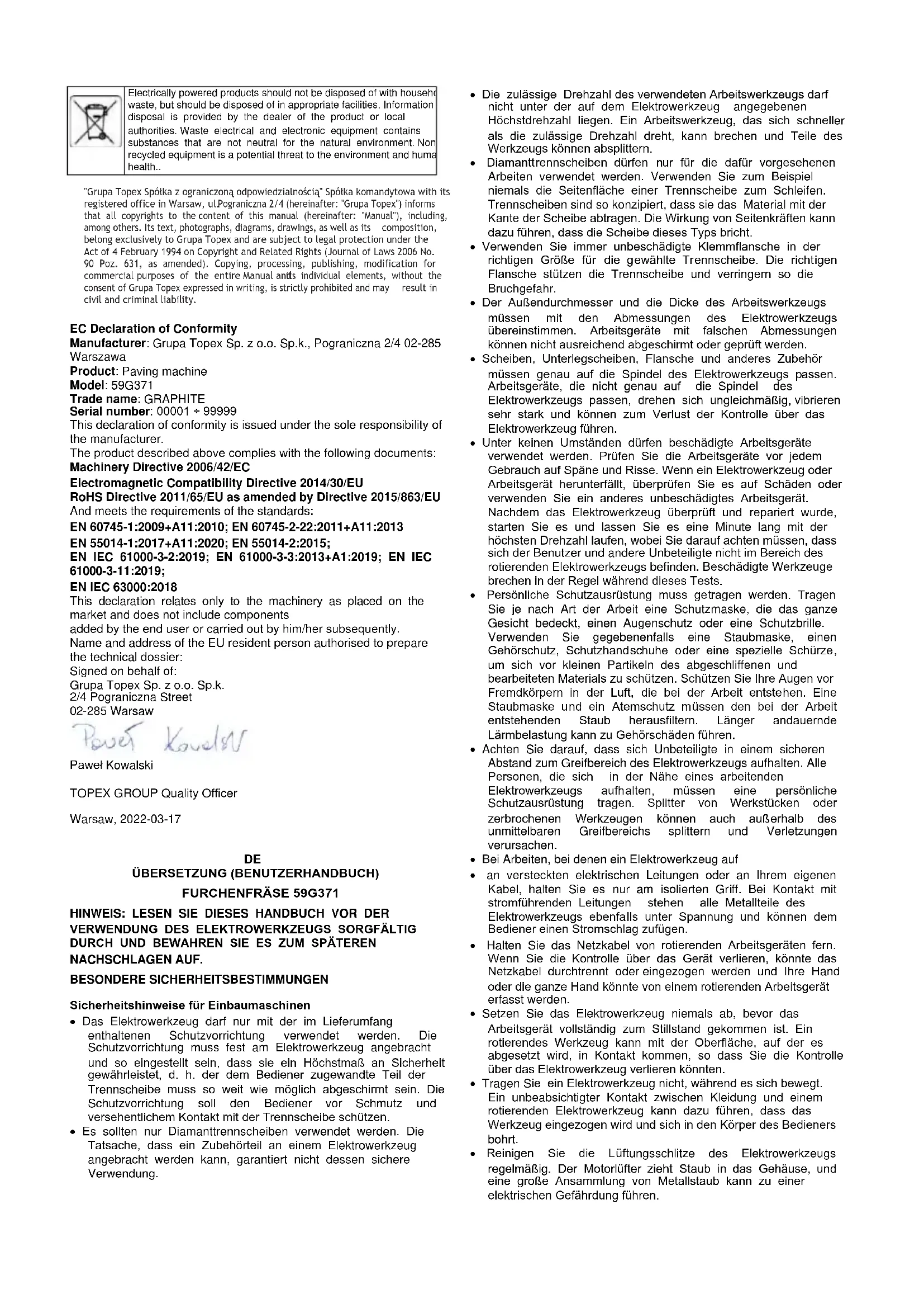 EG-Konformitätserklärung Hersteller: Grupa Topex Sp. z o.o. Sp.k., Pograniczna 2/4 02-285 Warszawa Produkt: Pflastermaschine Modell: 59G371 Handelsname: GRAPHITE Seriennummer: 00001 ÷ 99999 Diese Konformitätserklärung wird unter der alleinigen Verantwortung des Herstellers ausgestellt. Das oben beschriebene Produkt entspricht den folgenden Dokumenten: Maschinenrichtlinie 2006/42/EG Richtlinie 2014/30/EU über die elektromagnetische Verträglichkeit RoHS-Richtlinie 2011/65/EU, geändert durch Richtlinie 2015/863/EU Und erfüllt die Anforderungen der Normen: EN 60745-1:2009+A11:2010; EN 60745-2-22:2011+A11:2013 EN 55014-1:2017+A11:2020; EN 55014-2:2015; EN IEC 61000-3-2:2019; EN 61000-3-3:2013+A1:2019; EN IEC 61000-3-11:2019; EN IEC 63000:2018 Diese Erklärung bezieht sich nur auf die Maschine in der Form, in der sie in Verkehr gebracht wird, und umfasst nicht die Bauteile vom Endnutzer hinzugefügt oder von ihm nachträglich durchgeführt werden. Name und Anschrift der in der EU ansässigen Person, die zur Erstellung des technischen Dossiers befugt ist: Unterzeichnet im Namen von: Grupa Topex Sp. z o.o. Sp.k. 2/4 Pograniczna Straße 02-285 Warschau Paweł Kowalski TOPEX GROUP Qualitätsbeauftragter Warschau, 2022-03-17