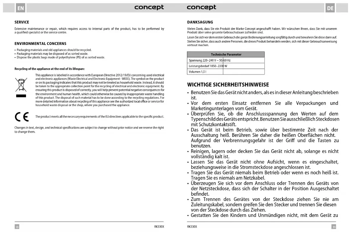 - Die Polyäthylen-Beutel (PE) geben Sie zum Recyceln des Sammelmaterials ab. Recycling des Gerätes am Ende seiner Lebensdauer: Dieses Gerät ist im Einklang mit der Europäischen Richtlinie 2012/19/EU über Elektro- und Elektronik- Altgeräte (WEEE) gekennzeichnet. Das Symbol am Produkt oder an dessen Verpackung gibt an, dass dieses Produkt nicht in den Haushaltsabfall gehört. Es ist auf eine Sammelstelle zum Recyceln der elektrischen und elektronischen Anlagen zu bringen. Durch die Sicherstellung der korrekten Entsorgung dieses Produktes helfen Sie, negative Konsequenzen für die Umwelt und die Gesundheit der Menschen zu verhindern, die durch die unsachgemäße Entsorgung dieses Produktes verursacht würden. Die Entsorgung muss im Einklang mit den Vorschriften für die Abfallbehandlung durchgeführt werden. Ausführlichere Informationen zum Recycling dieses Produkts erhalten Sie bei der zuständigen örtlichen Behörde, dem Dienstleister für Entsorgung von Haushaltsabfall oder in dem Geschäft, wo Sie das Produkt gekauft haben. Dieses Produkt erfüllt sämtliche Grundanforderungen der EU-Richtlinien, die sich darauf beziehen. Lebensmittel sind Die Änderungen im Text, im Design und in den technischen Spezifizierungen können ohne vorherigen Hinweis geändert werden, und wir behalten uns das Recht auf deren Änderungen vor. MERCI Nous vous remercions d’avoir acheté le produit de la marque Concept et nous espérons qu’il vous apportera votre entière satisfaction pendant son utilisation. Lire attentivement le manuel d’emploi avant la première utilisation et le conserver. Faire prendre connaissance du manuel d’emploi par les autres personnes pouvant manipuler le produit. Caractéristiques techniques Tension 220–240 V ~ 50/60 Hz Puissance 1850–2200 W Volume 1,5l PRÉCAUTIONS PARTICULIÈRES DE SÉCURITÉ