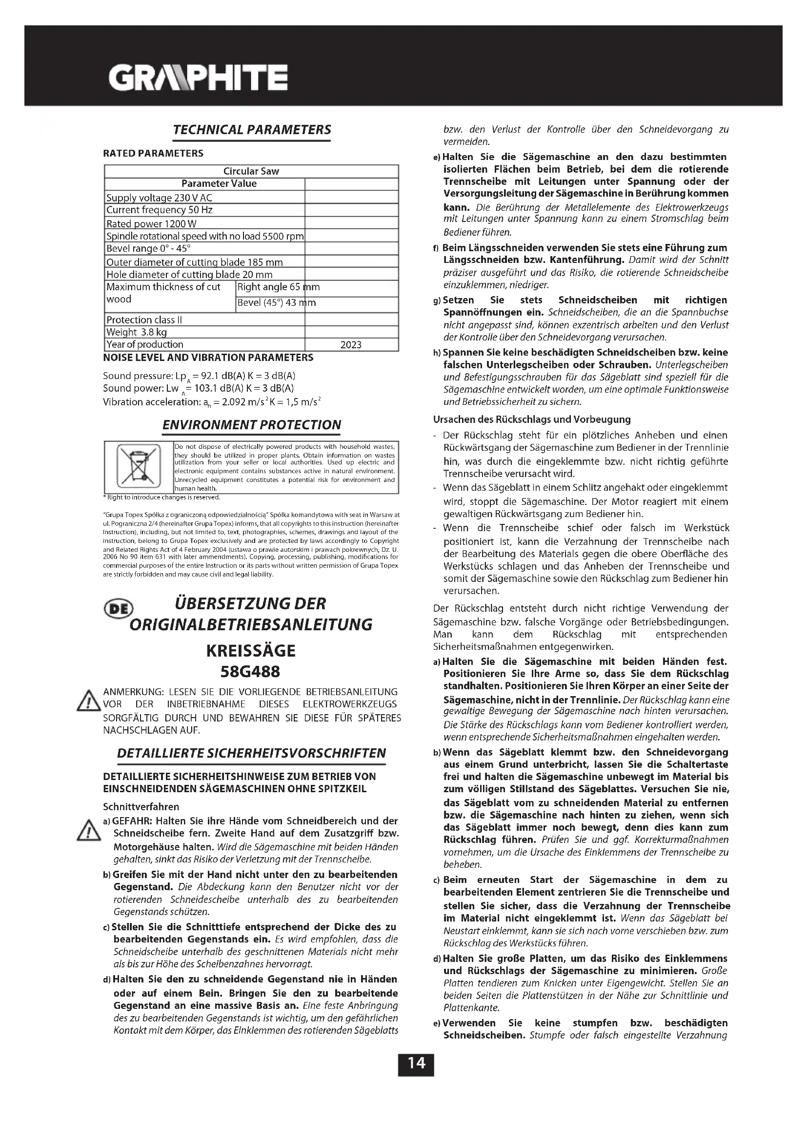 EG-Konformitätserklärung Hersteller: Grupa Topex Sp. z o.o. Sp.k., Pograniczna 2/4 02-285 Warszawa Produkt: Kreissäge Modell: 58G488 Handelsname: GRAPHITE Seriennummer: 00001 ÷ 99999 Diese Konformitätserklärung wird unter der alleinigen Verantwortung des Herstellers ausgestellt. Das oben beschriebene Produkt entspricht den folgenden Dokumenten: Maschinenrichtlinie 2006/42/EG Richtlinie 2014/30/EU über die elektromagnetische Verträglichkeit RoHS-Richtlinie 2011/65/EU, geändert durch Richtlinie 2015/863/EU Und erfüllt die Anforderungen der Normen: EN 62841-1:2015/A11:2022; EN 62841-2-5:2014; EN IEC 55014-1:2021; EN IEC 55014-2:2021; EN IEC 61000-3- 2:2019/A1:2021; EN 61000-3-3:2013/A2:2021; EN IEC 63000:2018 Benannte Stelle: Nr. 0123; TŰV SŰD Product Service GmbH, Ridlerstraβe 65, 80339 Műnchen, Deutschland EG-Baumusterprüfbescheinigung Nr: M8A 097526 0070 Rev. 02 Diese Erklärung bezieht sich nur auf die Maschine in der Form, in der sie in Verkehr gebracht wird, und umfasst nicht die Bauteile vom Endnutzer hinzugefügt oder von ihm nachträglich durchgeführt werden. Name und Anschrift der in der EU ansässigen Person, die zur Erstellung des technischen Dossiers befugt ist: Unterzeichnet im Namen von: Grupa Topex Sp. z o.o. Sp.k. 2/4 Pograniczna Straße 02-285 Warschau Paweł Kowalski TOPEX GROUP Qualitätsbeauftragter Warschau, 2023-07-31
