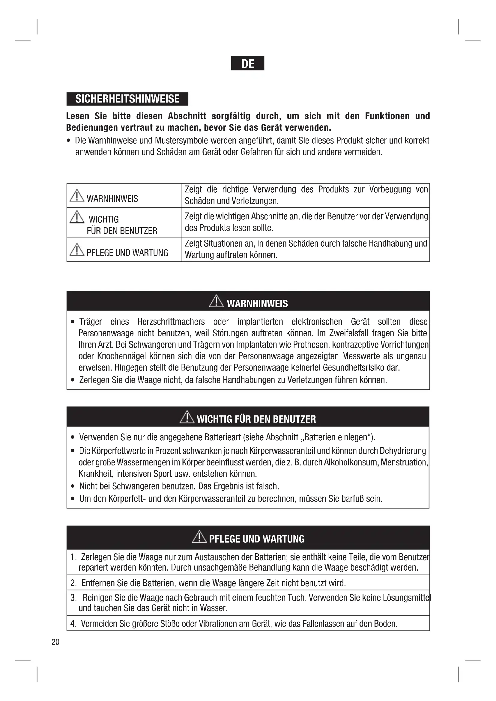 - Träger eines Herzschrittmachers oder implantierten elektronischen Gerät sollten diese Personenwaage nicht benutzen, weil Störungen auftreten können. Im Zweifelsfall fragen Sie bitte Ihren Arzt. Bei Schwangeren und Trägern von Implantaten wie Prothesen, kontrazeptive Vorrichtungen oder Knochennägel können sich die von der Personenwaage angezeigten Messwerte als ungenau erweisen. Hingegen stellt die Benutzung der Personenwaage keinerlei Gesundheitsrisiko dar.