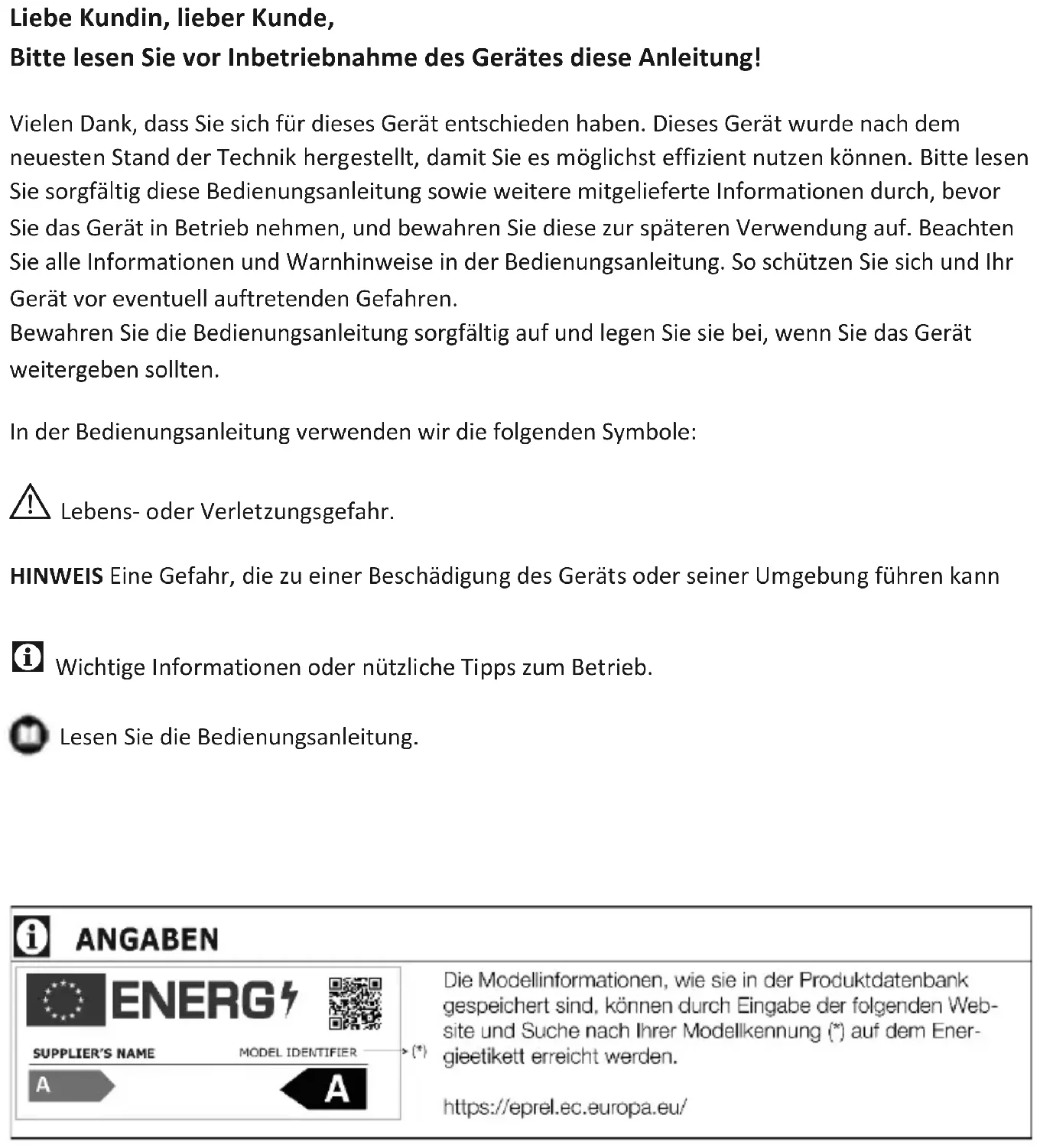 - Wir übernehmen keine Haftung für Schäden, die durch unsachgemäßen Umgang entstehen. A Aufstellung und Reparaturen dürfen nur durch einen autorisierten Kundendienst erfolgen. A Verwenden Sie nur Original-Ersatzteile und- Zubehör. A Originalersatzteile werden ab dem Kaufdatum des Produktes 10 Jahre lang bereitgestellt. A Reparieren oder ersetzen Sie nur Geräteteile, bei denen dies ausdrücklich in der Bedienungsanleitung steht. A Nehmen Sie keine Änderungen am Gerät vor. A 1.1. Bestimmungsgemäßer Gebrauch