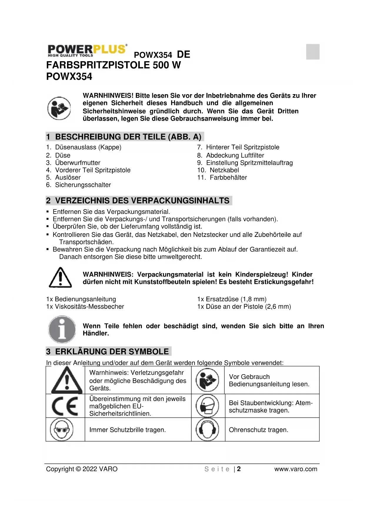 Copyright © 2022 VARO S e i t e | 2 www.varo.com FARBSPRITZPISTOLE 500 W POWX354 WARNHINWEIS! Bitte lesen Sie vor der Inbetriebnahme des Geräts zu Ihrer eigenen Sicherheit dieses Handbuch und die allgemeinen Sicherheitshinweise gründlich durch. Wenn Sie das Gerät Dritten überlassen, legen Sie diese Gebrauchsanweisung immer bei. 1 BESCHREIBUNG DER TEILE (ABB. A)