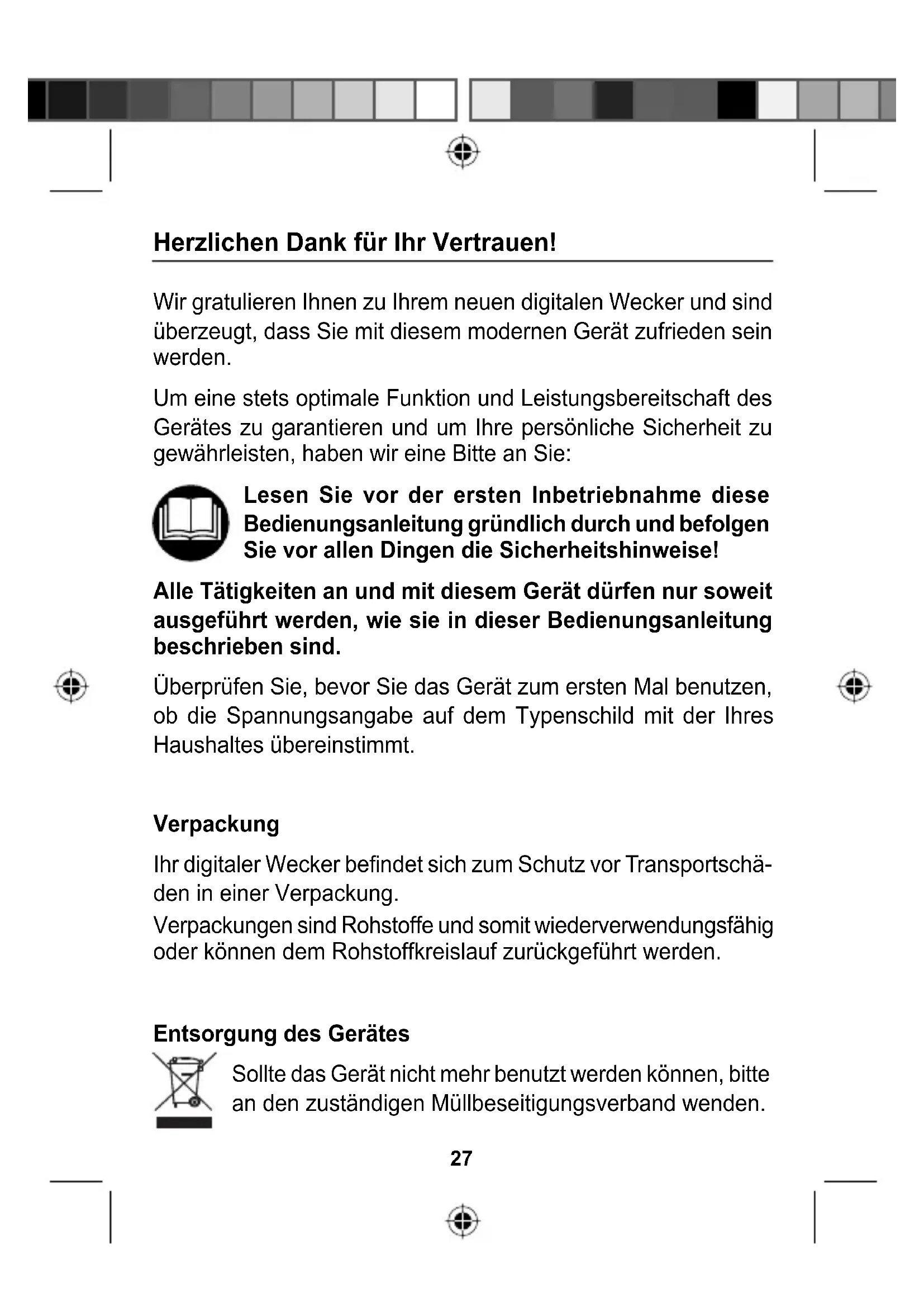 - GARANTIEBEDINGUNGEN - 37 GARANTIEKARTE Letzte Seite BDA DW 166 a und b DE.indd 1BDA DW 166 a und b DE.indd 1 10.08.2006 9:22:08 Uhr10.08.2006 9:22:08 Uhr27 Wir gratulieren Ihnen zu Ihrem neuen digitalen Wecker und sind überzeugt, dass Sie mit diesem modernen Gerät zufrieden sein werden. Um eine stets optimale Funktion und Leistungsbereitschaft des Gerätes zu garantieren und um Ihre persönliche Sicherheit zu gewährleisten, haben wir eine Bitte an Sie: Lesen Sie vor der ersten Inbetriebnahme diese Bedienungsanleitung gründlich durch und befolgen Sie vor allen Dingen die Sicherheitshinweise! Alle Tätigkeiten an und mit diesem Gerät dürfen nur soweit ausgeführt werden, wie sie in dieser Bedienungsanleitung beschrieben sind. Überprüfen Sie, bevor Sie das Gerät zum ersten Mal benutzen, ob die Spannungsangabe auf dem Typenschild mit der Ihres Haushaltes übereinstimmt. Verpackung Ihr digitaler Wecker befi ndet sich zum Schutz vor Transportschä- den in einer Verpackung. Verpackungen sind Rohstoffe und somit wiederverwendungsfähig oder können dem Rohstoffkreislauf zurückgeführt werden. Entsorgung des Gerätes Sollte das Gerät nicht mehr benutzt werden können, bitte an den zuständigen Müllbeseitigungsverband wenden. Herzlichen Dank für Ihr Vertrauen! BDA DW 166 a und b DE.indd 2BDA DW 166 a und b DE.indd 2 10.08.2006 9:22:08 Uhr10.08.2006 9:22:08 Uhr28 SICHERHEITSHINWEISE Damit Sie Ihr neues Gerät sicher und zuverlässig nutzen können, lesen Sie bitte die Sicherheitshin- weise und diese Bedienungsanlei- tung sorgfältig durch, bevor Sie das Gerät anschließen. Bei Weitergabe des Gerätes an andere Personen geben Sie auch die Bedienungsanleitung mit. Bestimmungsgemäßer Gebrauch Das Gerät dient zur Anzeige der Uhrzeit. Zusätzlich ist die Einstellung einer Weckzeit möglich. Zur eingestellten Weckzeit ertönt ein Signal. Allgemeine Hinweise Nehmen Sie das Gerät nicht in Betrieb, wenn Gerät oder An- schlussleitungen sichtbare Schäden aufweisen oder das Gerät heruntergefallen ist. Im Innern des Gerätes gibt es gefährliche Spannungen. Niemals das Gehäuse öffnen oder durch die Belüftung Gegenstände einführen. Hinweise für die Benutzung Schließen Sie das Gerät nur an eine vorschriftsmäßig installierte 230 V Steckdose an, die entsprechend abgesichert ist. Achten Sie darauf, dass die Anschlussleitungen nicht zur Stolperfalle werden. Achten Sie darauf, dass die Anschlussleitungen nicht geklemmt oder gequetscht werden. ACHTUNG BRANDGEFAHR! Steckdosen und Verlängerungs- BDA DW 166 a und b DE.indd 3BDA DW 166 a und b DE.indd 3 10.08.2006 9:22:08 Uhr10.08.2006 9:22:08 Uhr29 kabel dürfen nicht überlastet werden. Fragen Sie beim Erwerb nach der maximalen zulässigen Stromaufnahme. Lassen Sie Reparaturen am Gerät nur vom Service-Center bzw. einer Fachwerkstatt durchführen. Durch unsachgemäße Reparaturen können erhebliche Gefahren für den Benutzer entstehen. Auf keinen Fall an dem Gerät bauliche Verände- rungen vornehmen. Sie gefährden hierdurch Ihre Sicherheit. Wenn die Netzanschlussleitung beschädigt ist, darf sie nur vom Service-Center bzw. einer Fachwerkstatt ersetzt werden, um Gefährdungen zu vermeiden. Es dürfen keine mit Flüssigkeit gefüllten Gegenstände, z.B. Vasen, auf das Gerät gestellt werden. Das Gerät darf nicht Tropf- oder Spritzwasser ausgesetzt werden. Verhindern Sie, dass Flüssigkeit in das Gerät gelangt. Notfalls sofort den Netzstecker ziehen. Das Gerät darf nicht in Feuchträumen (z.B. Badezimmer) oder Räumen mit starkem Staubanfall verwendet werden. Die im Inneren des Gerätes aufgestaute Hitze kann zum Defekt bzw. zum Brand führen. Setzen Sie dieses Gerät daher keiner extremen Temperatur aus: p. 36