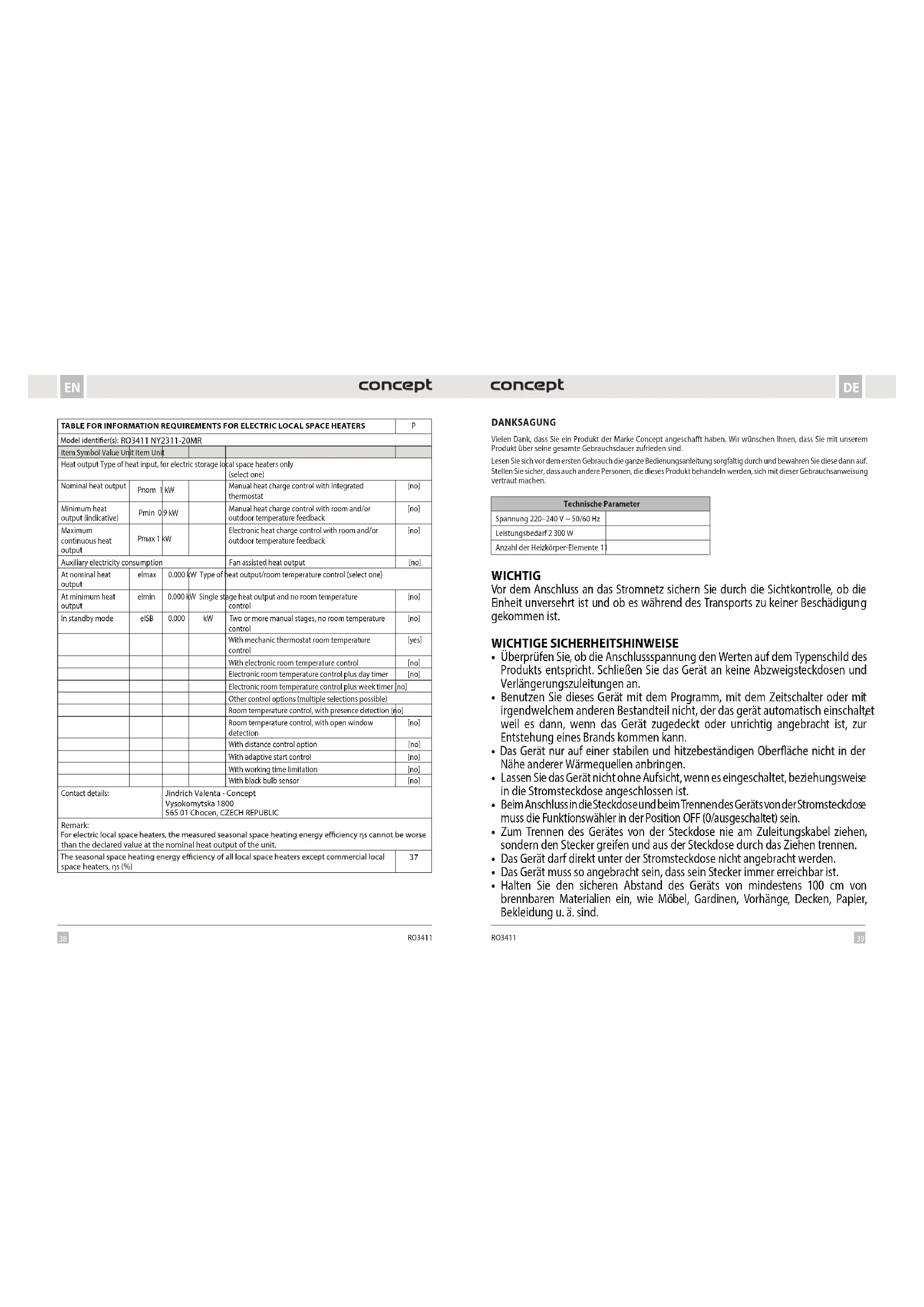 RO3411 DANKSAGUNG Vielen Dank, dass Sie ein Produkt der Marke Concept angeschafft haben. Wir wünschen Ihnen, dass Sie mit unserem Produkt über seine gesamte Gebrauchsdauer zufrieden sind.Lesen Sie sich vor dem ersten Gebrauch die ganze Bedienungsanleitung sorgfältig durch und bewahren Sie diese dann auf. Stellen Sie sicher, dass auch andere Personen, die dieses Produkt behandeln werden, sich mit dieser Gebrauchsanweisung vertraut machen.Technische ParameterSpannung 220–240 V ~ 50/60 HzLeistungsbedarf 2 300 WAnzahl der Heizkörper-Elemente 11 TABLE FOR INFORMATION REQUIREMENTS FOR ELECTRIC LOCAL SPACE HEATERS