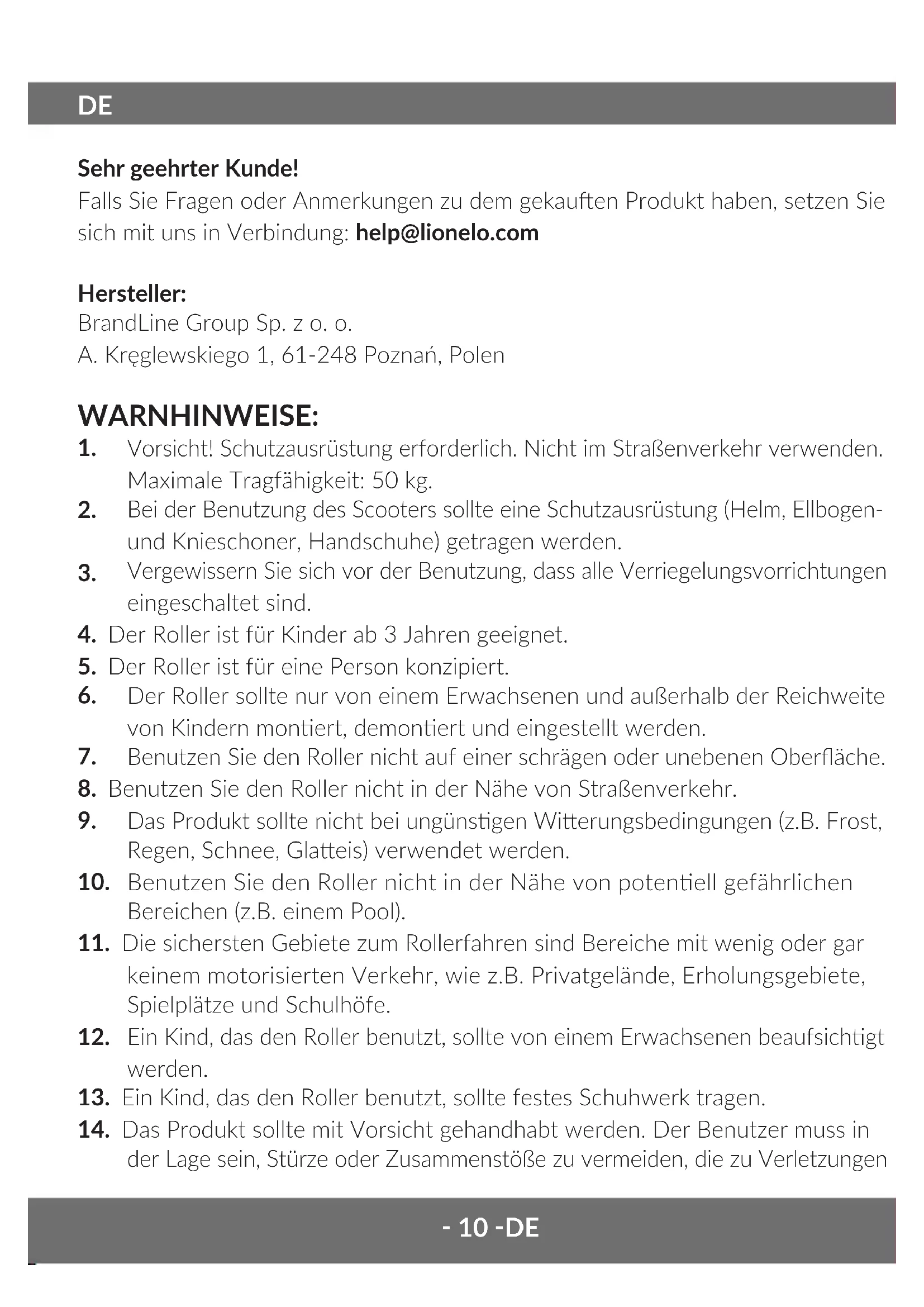 Sehr geehrter Kunde! Falls Sie Fragen oder Anmerkungen zu dem gekauen Produkt haben, setzen Sie sich mit uns in Verbindung: help@lionelo.com Hersteller: BrandLine Group Sp. z o. o. A. Kręglewskiego 1, 61-248 Poznań, Polen WARNHINWEISE: