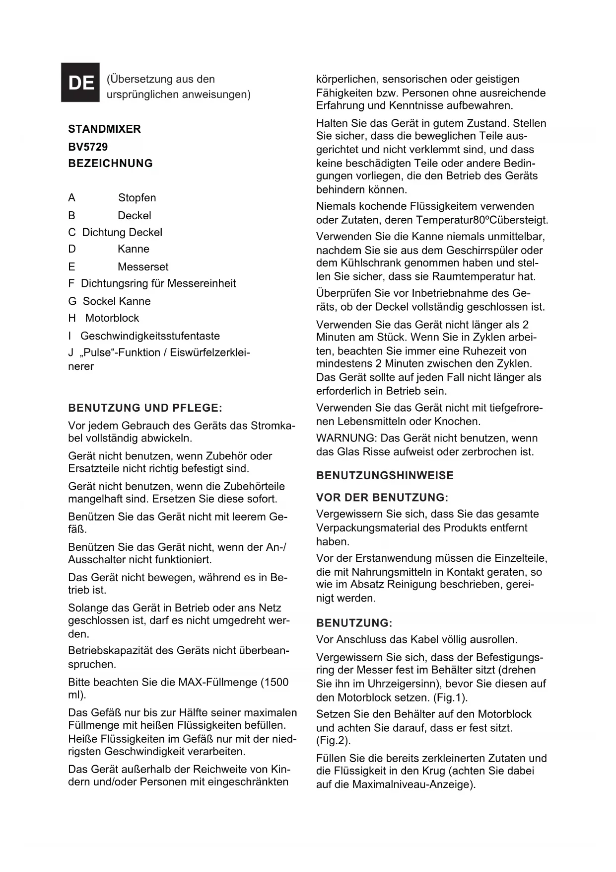 EFECTIVA: Desendollar l’aparell de la xarxa i deixar-lo refredar abans de dur a terme qualsevol opera- ció de neteja. Auixeu l’anella de xació de les ganivetes girant-lo en el sentit contrari a les agulles del rellotge. (Fig.3). Extraieu les ganivetes i la junta de xació i procediu a netejar-los. (Fig.4). Després de la neteja, torneu a col·locar les ganivetes i gireu l’anella de xació en el sentit contrari. (Fig.5).STANDMIXER BV5729 BEZEICHNUNG A Stopfen B Deckel C Dichtung Deckel D Kanne E Messerset F Dichtungsring für Messereinheit G Sockel Kanne H Motorblock I Geschwindigkeitsstufentaste J „Pulse“-Funktion / Eiswürfelzerklei- nerer BENUTZUNG UND PFLEGE: Vor jedem Gebrauch des Geräts das Stromka- bel vollständig abwickeln. Gerät nicht benutzen, wenn Zubehör oder Ersatzteile nicht richtig befestigt sind. Gerät nicht benutzen, wenn die Zubehörteile mangelhaft sind. Ersetzen Sie diese sofort. Benützen Sie das Gerät nicht mit leerem Ge- fäß. Benützen Sie das Gerät nicht, wenn der An-/ Ausschalter nicht funktioniert. Das Gerät nicht bewegen, während es in Be- trieb ist. Solange das Gerät in Betrieb oder ans Netz geschlossen ist, darf es nicht umgedreht wer- den. Betriebskapazität des Geräts nicht überbean- spruchen. Bitte beachten Sie die MAX-Füllmenge (1500 ml). Das Gefäß nur bis zur Hälfte seiner maximalen Füllmenge mit heißen Flüssigkeiten befüllen. Heiße Flüssigkeiten im Gefäß nur mit der nied- rigsten Geschwindigkeit verarbeiten. Das Gerät außerhalb der Reichweite von Kin- dern und/oder Personen mit eingeschränkten körperlichen, sensorischen oder geistigen Fähigkeiten bzw. Personen ohne ausreichende Erfahrung und Kenntnisse aufbewahren. Halten Sie das Gerät in gutem Zustand. Stellen Sie sicher, dass die beweglichen Teile aus- gerichtet und nicht verklemmt sind, und dass keine beschädigten Teile oder andere Bedin- gungen vorliegen, die den Betrieb des Geräts behindern können. Niemals kochende Flüssigkeitem verwenden oder Zutaten, deren Temperatur80ºCübersteigt. Verwenden Sie die Kanne niemals unmittelbar, nachdem Sie sie aus dem Geschirrspüler oder dem Kühlschrank genommen haben und stel- len Sie sicher, dass sie Raumtemperatur hat. Überprüfen Sie vor Inbetriebnahme des Ge- räts, ob der Deckel vollständig geschlossen ist. Verwenden Sie das Gerät nicht länger als 2 Minuten am Stück. Wenn Sie in Zyklen arbei- ten, beachten Sie immer eine Ruhezeit von mindestens 2 Minuten zwischen den Zyklen. Das Gerät sollte auf jeden Fall nicht länger als erforderlich in Betrieb sein. Verwenden Sie das Gerät nicht mit tiefgefrore- nen Lebensmitteln oder Knochen. WARNUNG: Das Gerät nicht benutzen, wenn das Glas Risse aufweist oder zerbrochen ist. BENUTZUNGSHINWEISE VOR DER BENUTZUNG: Vergewissern Sie sich, dass Sie das gesamte Verpackungsmaterial des Produkts entfernt haben. Vor der Erstanwendung müssen die Einzelteile, die mit Nahrungsmitteln in Kontakt geraten, so wie im Absatz Reinigung beschrieben, gerei- nigt werden. BENUTZUNG: Vor Anschluss das Kabel völlig ausrollen. Vergewissern Sie sich, dass der Befestigungs- ring der Messer fest im Behälter sitzt (drehen Sie ihn im Uhrzeigersinn), bevor Sie diesen auf den Motorblock setzen. (Fig.1). Setzen Sie den Behälter auf den Motorblock und achten Sie darauf, dass er fest sitzt. (Fig.2). Füllen Sie die bereits zerkleinerten Zutaten und die Flüssigkeit in den Krug (achten Sie dabei auf die Maximalniveau-Anzeige). (Übersetzung aus den ursprünglichen anweisungen) DEDecken Sie den Krug ab und überprüfen Sie, ob er gut angebracht ist. Setzen Sie den Stopfen in den Deckel. Schließen Sie das Gerät an das Stromnetz an. Die Leuchtanzeige leuchtet auf. Durch Betätigen des Schalters das Gerät in Betrieb setzen. Wenn Sie weitere Zutaten hinzugeben wollen, ziehen Sie den Stopfen heraus. Geben Sie die Zutaten hinzu und setzen Sie den Stopfen wieder ein. Zum Abstellen, den Wahlschalter auf Position “0” stellen. Um einen zu abrupten Start zu vermeiden, empfehlen wir zu Anfang den Leistungsschalter auf seine Mindestposition zu stellen und die Geschwindigkeit dann nach dem Start des Geräts schrittweise zu erhöhen. ELEKTRONISCHE GESCHWINDIGKEITS- KONTROLLE: Die Geschwindigkeit des Geräts lässt sich ein- fach mit dem Geschwindigkeitsschalter regeln (I). Diese Funktion ist äußerst nützlich, da die Geschwindigkeit an die entsprechende Arbeit angepasst werden kann. NACH DER BENUTZUNG DES GERÄTS: Das Gerät ausschalten, indem Sie die Position 0 der Steuerung anwählen. Den Stecker aus der Netzdose ziehen. Nehmen Sie den Behälter vom Motorblock. Reinigen Sie das Gerät.