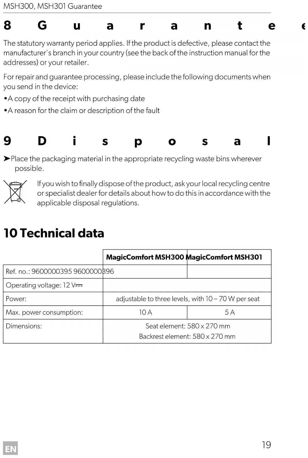 Wenn Sie das Produkt endgültig außer Betrieb nehmen, informieren Sie sich bitte beim nächsten Recyclingcenter oder bei Ihrem Fachhändler über die zutreffenden Entsorgungsvorschriften. 10 Technische Daten MagicComfort MSH300 MagicComfort MSH301Art.-Nr.: 9600000395 9600000396Betriebsspannung: 12 Vg Leistung: in drei Stufen regulierbar von 10 – 70 Watt pro Sitz Max. Stromaufnahme: 10 A 5 AAbmessungen: Sitzelement: 580 x 270 mmLehnenelement: 580 x 270 mm MSH300--IO-16s.book Seite 30 Donnerstag, 13. Juli 2017 10:28 10FR MSH300, MSH301