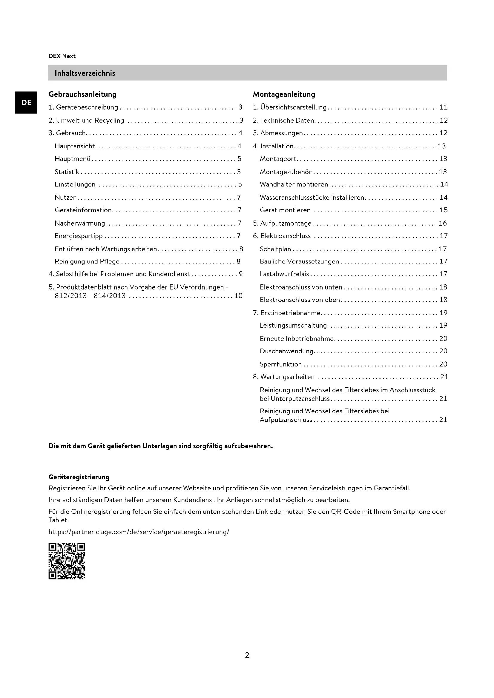 Inhaltsverzeichnis Gebrauchsanleitung . Gerätebeschreibung ..................................... Umwelt und Recycling ................................... Gebrauch ............................................. Hauptansicht .......................................... Hauptmenü ........................................... Statistik .............................................. Einstellungen ......................................... Nutzer ............................................... Geräteinformation ..................................... Nacherwärmung ....................................... Energiespartipp ....................................... Entlüften nach Wartungs arbeiten ........................ Reinigung und Pflege .................................... Selbsthilfe bei Problemen und Kundendienst ................ Produktdatenblatt nach Vorgabe der EU Verordnungen - / / ............................... Montageanleitung . Übersichtsdarstellung ................................... Technische Daten ....................................... Abmessungen .......................................... Installation... Montageort .......................................... Montagezubehör ..................................... Wandhalter montieren ................................ Wasseranschlussstücke installieren ...................... Gerät montieren ....................................... Aufputzmontage ....................................... Elektroanschluss ..................................... Schaltplan ........................................... Bauliche Voraussetzungen ............................. Lastabwurfrelais ...................................... Elektroanschluss von unten ............................ Elektroanschluss von oben ............................... Erstinbetriebnahme ................................... Leistungsumschaltung ................................. Erneute Inbetriebnahme ............................... Duschanwendung ..................................... Sperrfunktion .......................................... Wartungsarbeiten .................................... Reinigung und Wechsel des Filtersiebes im Anschlussstück bei Unterputzanschluss ................................ Reinigung und Wechsel des Filtersiebes bei Aufputzanschluss ..................................... Geräteregistrierung Registrieren Sie Ihr Gerät online auf unserer Webseite und profitieren Sie von unseren Serviceleistungen im Garantiefall. Ihre vollständigen Daten helfen unserem Kundendienst Ihr Anliegen schnellstmöglich zu bearbeiten. Für die Onlineregistrierung folgen Sie einfach dem unten stehenden Link oder nutzen Sie den QR-Code mit Ihrem Smartphone oder Tablet. https://partner.clage.com/de/service/geraeteregistrierung/ Die mit dem Gerät gelieferten Unterlagen sind sorgfältig aufzubewahren.CLAGE