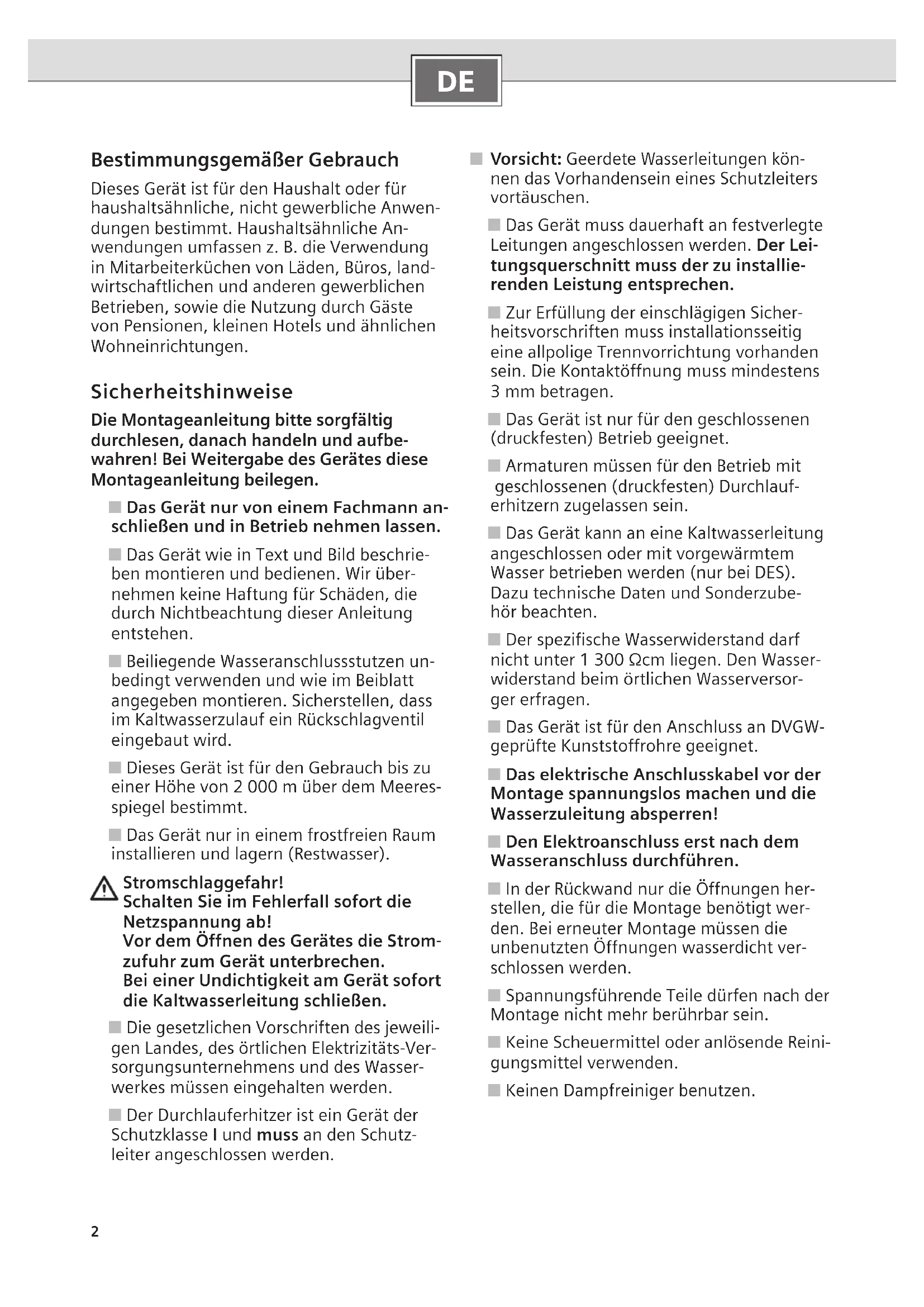 Bestimmungsgemäßer Gebrauch Dieses Gerät ist für den Haushalt oder für haushaltsähnliche, nicht gewerbliche Anwen- dungen bestimmt. Haushaltsähnliche An- wendungen umfassen z. B. die Verwendung in Mitarbeiterküchen von Läden, Büros, land- wirtschaftlichen und anderen gewerblichen Betrieben, sowie die Nutzung durch Gäste von Pensionen, kleinen Hotels und ähnlichen Wohneinrichtungen. Sicherheitshinweise Die Montageanleitung bitte sorgfältig durchlesen, danach handeln und aufbe- wahren! Bei Weitergabe des Gerätes diese Montageanleitung beilegen. ■ Das Gerät nur von einem Fachmann an- schließen und in Betrieb nehmen lassen. ■ Das Gerät wie in Text und Bild beschrie- ben montieren und bedienen. Wir über- nehmen keine Haftung für Schäden, die durch Nichtbeachtung dieser Anleitung entstehen. ■ Beiliegende Wasseranschlussstutzen un- bedingt verwenden und wie im Beiblatt angegeben montieren. Sicherstellen, dass im Kaltwasserzulauf ein Rückschlagventil eingebaut wird. ■ Dieses Gerät ist für den Gebrauch bis zu einer Höhe von 2 000 m über dem Meeres- spiegel bestimmt. ■ Das Gerät nur in einem frostfreien Raum installieren und lagern (Restwasser). Stromschlaggefahr! Schalten Sie im Fehlerfall sofort die Netzspannung ab! Vor dem Öffnen des Gerätes die Strom- zufuhr zum Gerät unterbrechen. Bei einer Undichtigkeit am Gerät sofort die Kaltwasserleitung schließen. ■ Die gesetzlichen Vorschriften des jeweili- gen Landes, des örtlichen Elektrizitäts-Ver- sorgungsunternehmens und des Wasser- werkes müssen eingehalten werden. ■ Der Durchlauferhitzer ist ein Gerät der Schutzklasse I und muss an den Schutz- leiter angeschlossen werden. ■ Vorsicht: Geerdete Wasserleitungen kön- nen das Vorhandensein eines Schutzleiters vortäuschen. ■ Das Gerät muss dauerhaft an festverlegte Leitungen angeschlossen werden. Der Lei- tungsquerschnitt muss der zu installie- renden Leistung entsprechen. ■ Zur Erfüllung der einschlägigen Sicher- heitsvorschriften muss installationsseitig eine allpolige Trennvorrichtung vorhanden sein. Die Kontaktöffnung muss mindestens 3 mm betragen. ■ Das Gerät ist nur für den geschlossenen (druckfesten) Betrieb geeignet. ■ Armaturen müssen für den Betrieb mit geschlossenen (druckfesten) Durchlauf- erhitzern zugelassen sein. ■ Das Gerät kann an eine Kaltwasserleitung angeschlossen oder mit vorgewärmtem Wasser betrieben werden (nur bei DES). Dazu technische Daten und Sonderzube- hör beachten. ■ Der spezifische Wasserwiderstand darf nicht unter 1 300 Ωcm liegen. Den Wasser- widerstand beim örtlichen Wasserversor- ger erfragen. ■ Das Gerät ist für den Anschluss an DVGW- geprüfte Kunststoffrohre geeignet. ■ Das elektrische Anschlusskabel vor der Montage spannungslos machen und die Wasserzuleitung absperren! ■ Den Elektroanschluss erst nach dem Wasseranschluss durchführen. ■ In der Rückwand nur die Öffnungen her- stellen, die für die Montage benötigt wer- den. Bei erneuter Montage müssen die unbenutzten Öffnungen wasserdicht ver- schlossen werden. ■ Spannungsführende Teile dürfen nach der Montage nicht mehr berührbar sein. ■ Keine Scheuermittel oder anlösende Reini- gungsmittel verwenden. ■ Keinen Dampfreiniger benutzen.3