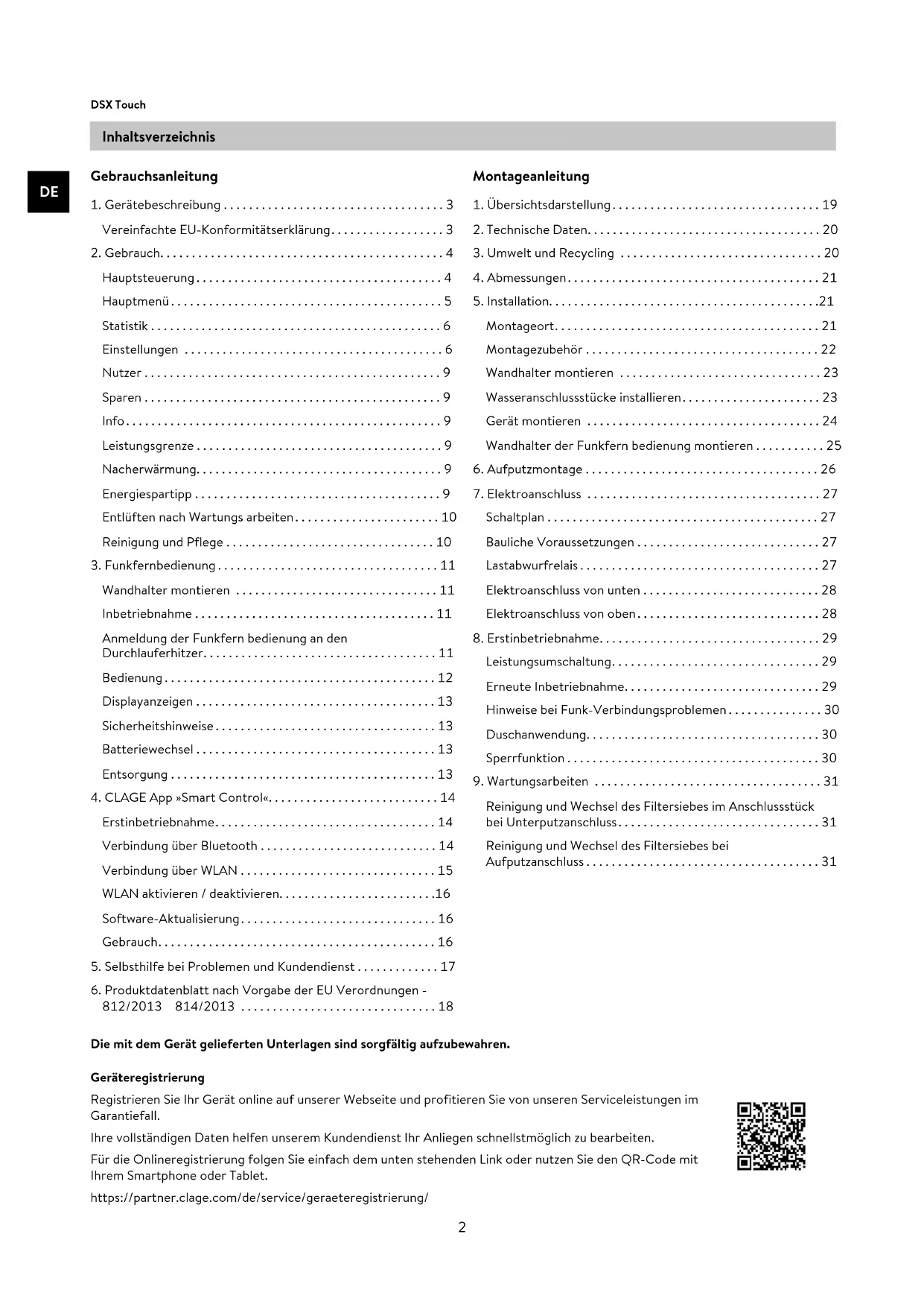 DSX Touch Inhaltsverzeichnis Gebrauchsanleitung . Gerätebeschreibung ................................... Vereinfachte EU-Konformitätserklärung .................... Gebrauch ............................................. Hauptsteuerung ....................................... Hauptmenü ........................................... Statistik .............................................. Einstellungen ......................................... Nutzer ............................................... Sparen ............................................... Info .................................................. Leistungsgrenze ....................................... Nacherwärmung ....................................... Energiespartipp ....................................... Entlüften nach Wartungs arbeiten ....................... Reinigung und Pflege ................................... Funkfernbedienung ................................... Wandhalter montieren ................................ Inbetriebnahme ...................................... Anmeldung der Funkfern bedienung an den Durchlauferhitzer ..................................... Bedienung ........................................... Displayanzeigen ...................................... Sicherheitshinweise ................................... Batteriewechsel ...................................... Entsorgung ............................................ CLAGE App »Smart Control« ........................... Erstinbetriebnahme ................................... Verbindung über Bluetooth ............................ Verbindung über WLAN ............................... WLAN aktivieren / deaktivieren... Software-Aktualisierung ............................... Gebrauch .............................................. Selbsthilfe bei Problemen und Kundendienst ............... Produktdatenblatt nach Vorgabe der EU Verordnungen - / / ............................... Montageanleitung . Übersichtsdarstellung ................................... Technische Daten ....................................... Umwelt und Recycling .................................. Abmessungen .......................................... Installation... Montageort .......................................... Montagezubehör ..................................... Wandhalter montieren ................................ Wasseranschlussstücke installieren ...................... Gerät montieren ..................................... Wandhalter der Funkfern bedienung montieren ............. Aufputzmontage ....................................... Elektroanschluss ..................................... Schaltplan ........................................... Bauliche Voraussetzungen ............................. Lastabwurfrelais ...................................... Elektroanschluss von unten ............................ Elektroanschluss von oben ............................... Erstinbetriebnahme ................................... Leistungsumschaltung ................................. Erneute Inbetriebnahme ............................... Hinweise bei Funk-Verbindungsproblemen ............... Duschanwendung ..................................... Sperrfunktion .......................................... Wartungsarbeiten .................................... Reinigung und Wechsel des Filtersiebes im Anschlussstück bei Unterputzanschluss ................................ Reinigung und Wechsel des Filtersiebes bei Aufputzanschluss ..................................... Geräteregistrierung Registrieren Sie Ihr Gerät online auf unserer Webseite und profitieren Sie von unseren Serviceleistungen im Garantiefall. Ihre vollständigen Daten helfen unserem Kundendienst Ihr Anliegen schnellstmöglich zu bearbeiten. Für die Onlineregistrierung folgen Sie einfach dem unten stehenden Link oder nutzen Sie den QR-Code mit Ihrem Smartphone oder Tablet. https://partner.clage.com/de/service/geraeteregistrierung/ Die mit dem Gerät gelieferten Unterlagen sind sorgfältig aufzubewahren.CLAGE