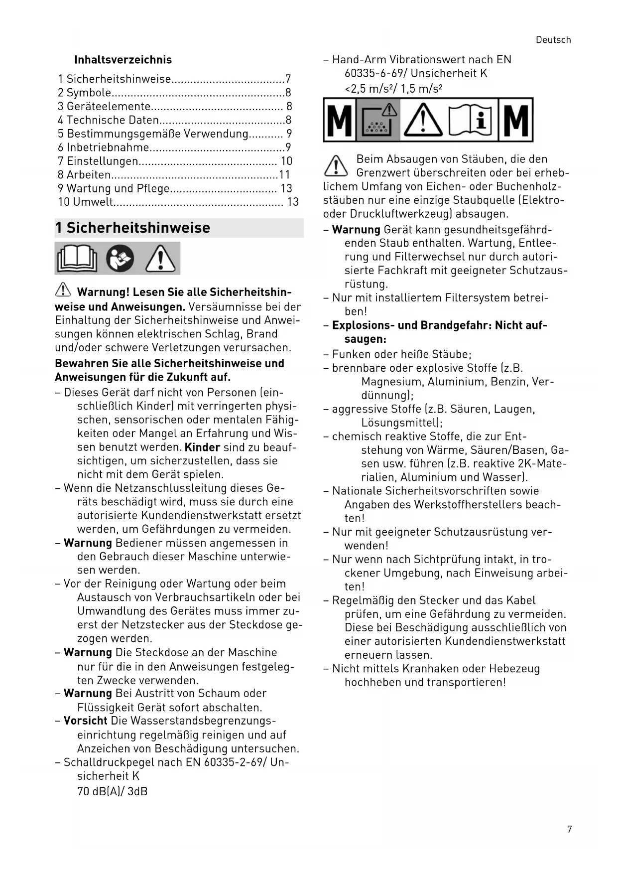 - 10 Umwelt 1 Sicherheitshinweise Warnung! Lesen Sie alle Sicherheitshin weise und Anweisungen. Versäumnisse bei der Einhaltung der Sicherheitshinweise und Anwei sungen können elektrischen Schlag, Brand und/oder schwere Verletzungen verursachen. Bewahren Sie alle Sicherheitshinweise und Anweisungen für die Zukunft auf. – Dieses Gerät darf nicht von Personen (ein schließlich Kinder) mit verringerten physi schen, sensorischen oder mentalen Fähig keiten oder Mangel an Erfahrung und Wis sen benutzt werden. Kinder sind zu beauf sichtigen, um sicherzustellen, dass sie nicht mit dem Gerät spielen. – Wenn die Netzanschlussleitung dieses Ge räts beschädigt wird, muss sie durch eine autorisierte Kundendienstwerkstatt ersetzt werden, um Gefährdungen zu vermeiden. – Warnung Bediener müssen angemessen in den Gebrauch dieser Maschine unterwie sen werden. – Vor der Reinigung oder Wartung oder beim Austausch von Verbrauchsartikeln oder bei Umwandlung des Gerätes muss immer zu erst der Netzstecker aus der Steckdose ge zogen werden. – Warnung Die Steckdose an der Maschine nur für die in den Anweisungen festgeleg ten Zwecke verwenden. – Warnung Bei Austritt von Schaum oder Flüssigkeit Gerät sofort abschalten. – Vorsicht Die Wasserstandsbegrenzungs einrichtung regelmäßig reinigen und auf Anzeichen von Beschädigung untersuchen. – Schalldruckpegel nach EN 60335-2-69/ Un sicherheit K 70 dB(A)/ 3dB – Hand-Arm Vibrationswert nach EN 60335-6-69/ Unsicherheit K <2,5 m/s²/ 1,5 m/s² Beim Absaugen von Stäuben, die den Grenzwert überschreiten oder bei erheb lichem Umfang von Eichen- oder Buchenholz stäuben nur eine einzige Staubquelle (Elektro- oder Druckluftwerkzeug) absaugen. – Warnung Gerät kann gesundheitsgefährd enden Staub enthalten. Wartung, Entlee rung und Filterwechsel nur durch autori sierte Fachkraft mit geeigneter Schutzaus rüstung. – Nur mit installiertem Filtersystem betrei ben! – Explosions- und Brandgefahr: Nicht auf saugen: – Funken oder heiße Stäube; – brennbare oder explosive Stoffe (z.B. Magnesium, Aluminium, Benzin, Ver dünnung); – aggressive Stoffe (z.B. Säuren, Laugen, Lösungsmittel); – chemisch reaktive Stoffe, die zur Ent stehung von Wärme, Säuren/Basen, Ga sen usw. führen (z.B. reaktive 2K-Mate rialien, Aluminium und Wasser). – Nationale Sicherheitsvorschriften sowie Angaben des Werkstoffherstellers beach ten! – Nur mit geeigneter Schutzausrüstung ver wenden! – Nur wenn nach Sichtprüfung intakt, in tro ckener Umgebung, nach Einweisung arbei ten! – Regelmäßig den Stecker und das Kabel prüfen, um eine Gefährdung zu vermeiden. Diese bei Beschädigung ausschließlich von einer autorisierten Kundendienstwerkstatt erneuern lassen. – Nicht mittels Kranhaken oder Hebezeug hochheben und transportieren! Deutsch 72 Symbole Warnung vor allgemeiner Gefahr Warnung vor Stromschlag Anleitung/Hinweise lesen! Atemschutz tragen! Warnung! Das Gerät kann gesundheitsgefährdenden Staub enthalten! Geeignet zur Abscheidung von Staub mit einem Expositions- Grenzwert größer als 0,1 mg/m p. 13