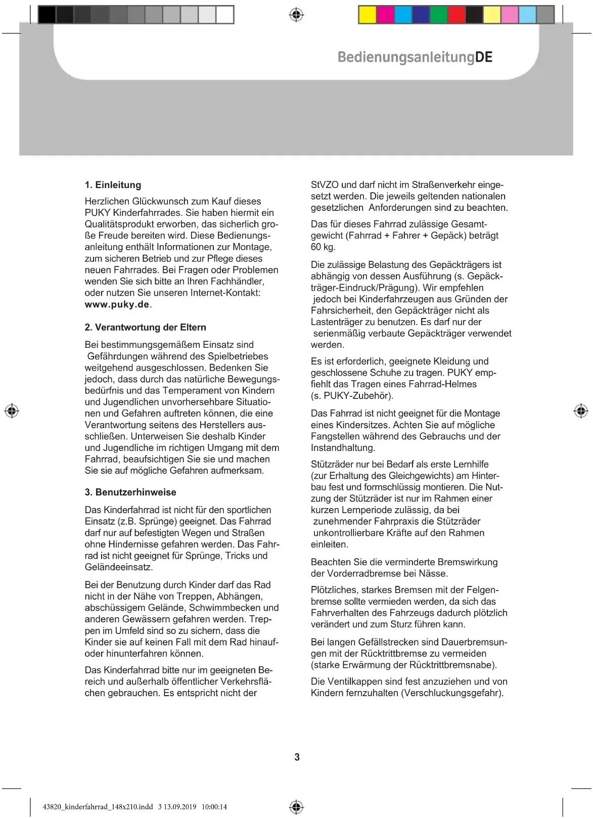 Das Kinderfahrrad ist nicht für den sportlichen Einsatz (z.B. Sprünge) geeignet. Das Fahrrad darf nur auf befestigten Wegen und Straßen ohne Hindernisse gefahren werden. Das Fahr- rad ist nicht geeignet für Sprünge, Tricks und Geländeeinsatz. Bei der Benutzung durch Kinder darf das Rad nicht in der Nähe von Treppen, Abhängen, abschüssigem Gelände, Schwimmbecken und anderen Gewässern gefahren werden. Trep- pen im Umfeld sind so zu sichern, dass die Kinder sie auf keinen Fall mit dem Rad hinauf- oder hinunterfahren können. Das Kinderfahrrad bitte nur im geeigneten Be- reich und außerhalb öffentlicher Verkehrsflä- chen gebrauchen. Es entspricht nicht der StVZO und darf nicht im Straßenverkehr einge- setzt werden. Die jeweils geltenden nationalen gesetzlichen Anforderungen sind zu beachten. Das für dieses Fahrrad zulässige Gesamt- gewicht (Fahrrad + Fahrer + Gepäck) beträgt 60 kg. Die zulässige Belastung des Gepäckträgers ist abhängig von dessen Ausführung (s. Gepäck- träger-Eindruck/Prägung). Wir empfehlen jedoch bei Kinderfahrzeugen aus Gründen der Fahrsicherheit, den Gepäckträger nicht als Lastenträger zu benutzen. Es darf nur der serienmäßig verbaute Gepäckträger verwendet werden. Es ist erforderlich, geeignete Kleidung und geschlossene Schuhe zu tragen. PUKY emp- fiehlt das Tragen eines Fahrrad-Helmes (s. PUKY-Zubehör). Das Fahrrad ist nicht geeignet für die Montage eines Kindersitzes. Achten Sie auf mögliche Fangstellen während des Gebrauchs und der Instandhaltung. Stützräder nur bei Bedarf als erste Lernhilfe (zur Erhaltung des Gleichgewichts) am Hinter- bau fest und formschlüssig montieren. Die Nut- zung der Stützräder ist nur im Rahmen einer kurzen Lernperiode zulässig, da bei zunehmender Fahrpraxis die Stützräder unkontrollierbare Kräfte auf den Rahmen einleiten. Beachten Sie die verminderte Bremswirkung der Vorderradbremse bei Nässe. Plötzliches, starkes Bremsen mit der Felgen- bremse sollte vermieden werden, da sich das Fahrverhalten des Fahrzeugs dadurch plötzlich verändert und zum Sturz führen kann. Bei langen Gefällstrecken sind Dauerbremsun- gen mit der Rücktrittbremse zu vermeiden (starke Erwärmung der Rücktrittbremsnabe). Die Ventilkappen sind fest anzuziehen und von Kindern fernzuhalten (Verschluckungsgefahr). 43820_kinderfahrrad_148x210.indd 3 13.09.2019 10:00:144 Bedienungsanleitung Kinderfahrrad Nachträgliche Anbauten und Veränderungen am Fahrrad (insbesondere an Bremseinrich- tungen) verändern die Fahreigenschaften und können zu einer Gefährdung führen.