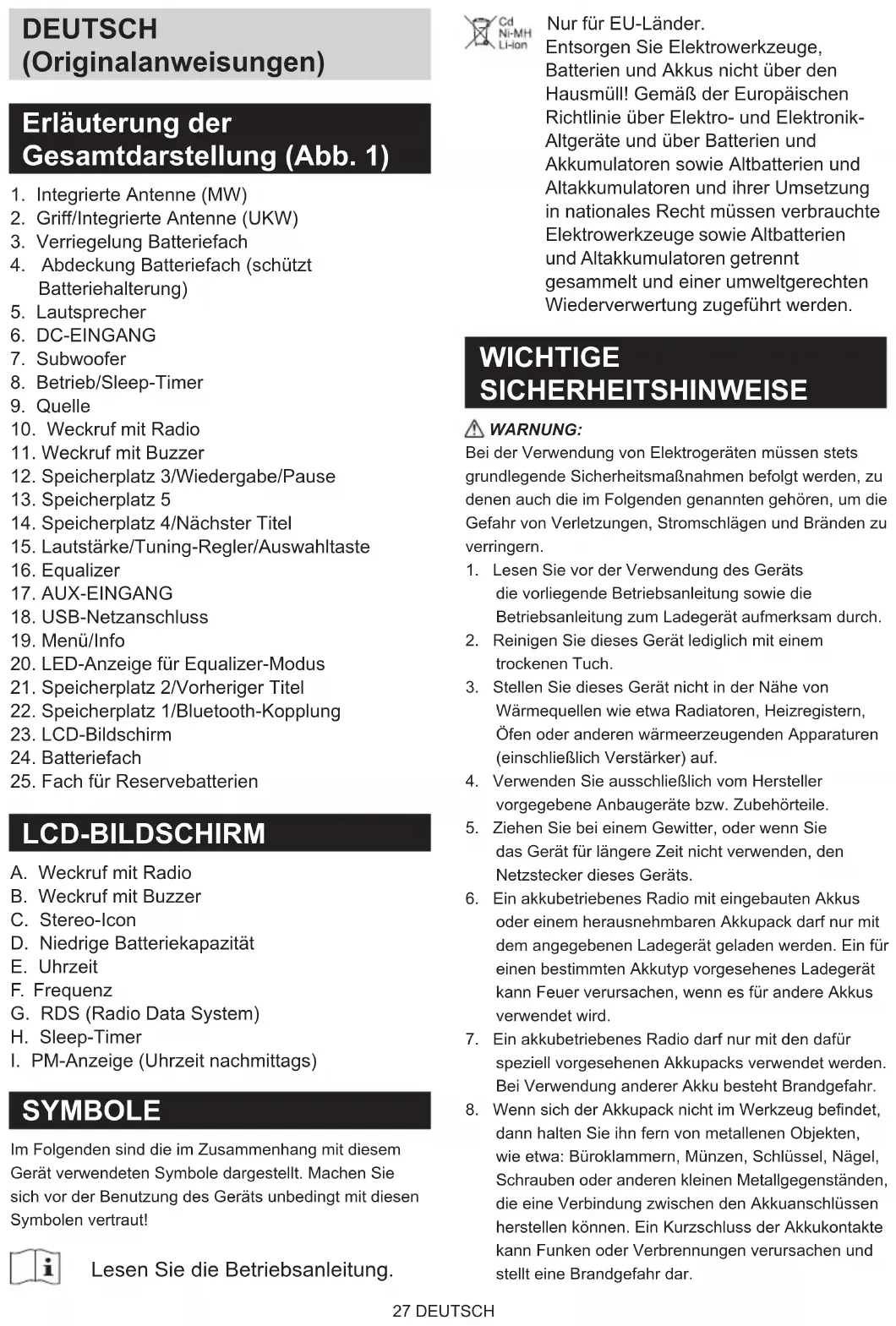 SYMBOLE Im Folgenden sind die im Zusammenhang mit diesem Gerät verwendeten Symbole dargestellt. Machen Sie sich vor der Benutzung des Geräts unbedingt mit diesen Symbolen vertraut! Lesen Sie die Betriebsanleitung. Nur für EU-Länder. Entsorgen Sie Elektrowerkzeuge, Batterien und Akkus nicht über den Hausmüll! Gemäß der Europäischen Richtlinie über Elektro- und Elektronik- Altgeräte und über Batterien und Akkumulatoren sowie Altbatterien und Altakkumulatoren und ihrer Umsetzung in nationales Recht müssen verbrauchte Elektrowerkzeuge sowie Altbatterien und Altakkumulatoren getrennt gesammelt und einer umweltgerechten Wiederverwertung zugeführt werden. WICHTIGE SICHERHEITSHINWEISE WARNUNG: Bei der Verwendung von Elektrogeräten müssen stets grundlegende Sicherheitsmaßnahmen befolgt werden, zu denen auch die im Folgenden genannten gehören, um die Gefahr von Verletzungen, Stromschlägen und Bränden zu verringern.