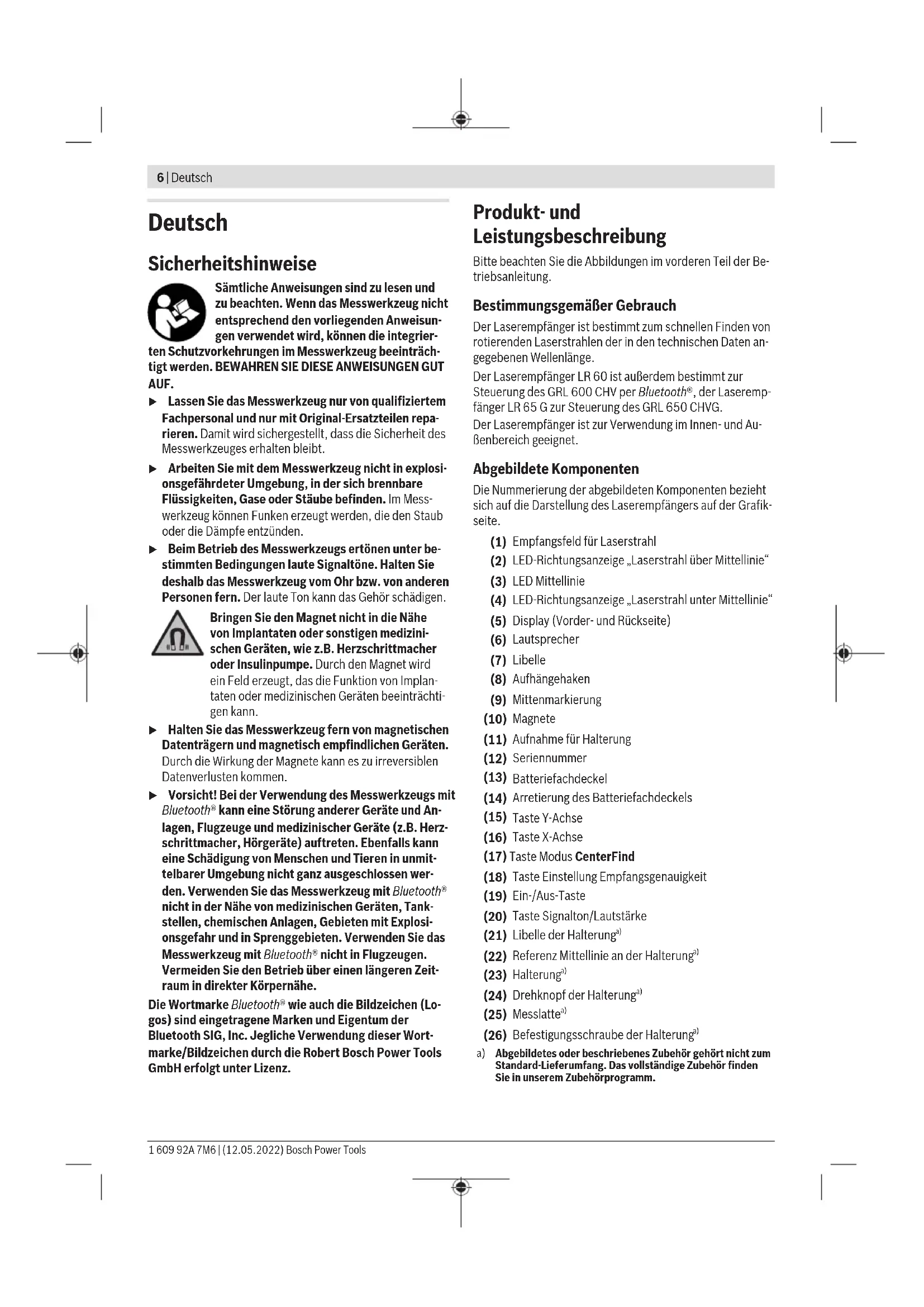 1 609 92A 7M6 | (12.05.2022) Bosch Power Tools6 | Deutsch Deutsch Sicherheitshinweise Sämtliche Anweisungen sind zu lesen und zu beachten. Wenn das Messwerkzeug nicht entsprechend den vorliegenden Anweisun- gen verwendet wird, können die integrier- ten Schutzvorkehrungen im Messwerkzeug beeinträch- tigt werden. BEWAHREN SIE DIESE ANWEISUNGEN GUT AUF. u Lassen Sie das Messwerkzeug nur von qualifiziertem Fachpersonal und nur mit Original-Ersatzteilen repa- rieren. Damit wird sichergestellt, dass die Sicherheit des Messwerkzeuges erhalten bleibt. u Arbeiten Sie mit dem Messwerkzeug nicht in explosi- onsgefährdeter Umgebung, in der sich brennbare Flüssigkeiten, Gase oder Stäube befinden. Im Mess- werkzeug können Funken erzeugt werden, die den Staub oder die Dämpfe entzünden. u Beim Betrieb des Messwerkzeugs ertönen unter be- stimmten Bedingungen laute Signaltöne. Halten Sie deshalb das Messwerkzeug vom Ohr bzw. von anderen Personen fern. Der laute Ton kann das Gehör schädigen. Bringen Sie den Magnet nicht in die Nähe von Implantaten oder sonstigen medizini- schen Geräten, wie z.B. Herzschrittmacher oder Insulinpumpe. Durch den Magnetwird ein Feld erzeugt, das die Funktion von Implan- taten oder medizinischen Geräten beeinträchti- gen kann. u Halten Sie das Messwerkzeug fern von magnetischen Datenträgern und magnetisch empfindlichen Geräten. Durch die Wirkung der Magnete kann es zu irreversiblen Datenverlusten kommen. u Vorsicht! Bei der Verwendung des Messwerkzeugs mit Bluetooth® kann eine Störung anderer Geräte und An- lagen, Flugzeuge und medizinischer Geräte (z.B. Herz- schrittmacher, Hörgeräte) auftreten. Ebenfalls kann eine Schädigung von Menschen und Tieren in unmit- telbarer Umgebung nicht ganz ausgeschlossen wer- den. Verwenden Sie das Messwerkzeug mit Bluetooth® nicht in der Nähe von medizinischen Geräten, Tank- stellen, chemischen Anlagen, Gebieten mit Explosi- onsgefahr und in Sprenggebieten. Verwenden Sie das Messwerkzeug mit Bluetooth® nicht in Flugzeugen. Vermeiden Sie den Betrieb über einen längeren Zeit- raum in direkter Körpernähe. Die Wortmarke Bluetooth® wie auch die Bildzeichen (Lo- gos) sind eingetragene Marken und Eigentum der Bluetooth SIG, Inc. Jegliche Verwendung dieser Wort- marke/Bildzeichen durch die Robert Bosch Power Tools GmbH erfolgt unter Lizenz. Produkt- und Leistungsbeschreibung Bitte beachten Sie die Abbildungen im vorderen Teil der Be- triebsanleitung. Bestimmungsgemäßer Gebrauch Der Laserempfänger ist bestimmt zum schnellen Finden von rotierenden Laserstrahlen der in den technischen Daten an- gegebenen Wellenlänge. Der Laserempfänger LR60 ist außerdem bestimmt zur Steuerung des GRL600CHV per Bluetooth®, der Laseremp- fänger LR65G zur Steuerung des GRL650CHVG. Der Laserempfänger ist zur Verwendung im Innen- und Au- ßenbereich geeignet. Abgebildete Komponenten Die Nummerierung der abgebildeten Komponenten bezieht sich auf die Darstellung des Laserempfängers auf der Grafik- seite. (1) Empfangsfeld für Laserstrahl (2) LED-Richtungsanzeige „Laserstrahl über Mittellinie“ (3) LED Mittellinie (4) LED-Richtungsanzeige „Laserstrahl unter Mittellinie“ (5) Display (Vorder- und Rückseite) (6) Lautsprecher (7) Libelle (8) Aufhängehaken (9) Mittenmarkierung (10) Magnete (11) Aufnahme für Halterung (12) Seriennummer (13) Batteriefachdeckel (14) Arretierung des Batteriefachdeckels (15) Taste Y‑Achse (16) Taste X‑Achse (17) Taste Modus CenterFind (18) Taste Einstellung Empfangsgenauigkeit (19) Ein-/Aus-Taste (20) Taste Signalton/Lautstärke (21) Libelle der Halterung