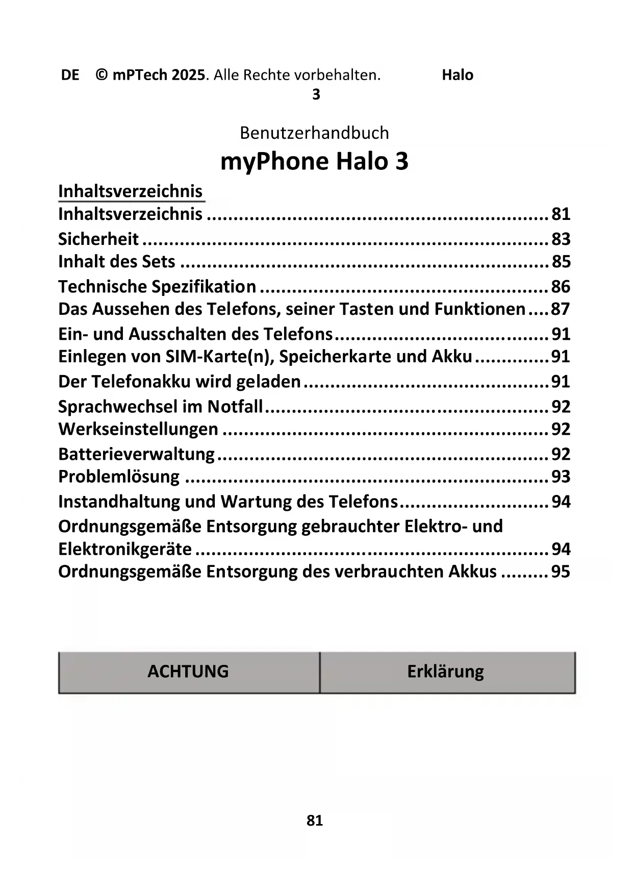 Kein Teil dieser Bedienungsanleitung darf ohne vorherige schriftliche Zustimmung des Herstellers in irgendeiner Form oder auf elektronischem oder mechanischem Wege reproduziert, verbreitet, übersetzt oder übertragen werden, einschließlich durch Erstellen von Fotokopien, Aufzeichnen oder Speichern in beliebigen Informationsspeicher- und - austauschsystemen. Vor der Verwendung des Geräts machen Sie sich mit den Informationen zu Vorsichtsmaßnahmen und mit der Bedienungsanleitung vertraut. Die Beschreibungen in dieser Bedienungsanleitung werden die Standardeinstellungen des Telefons berücksichtigt. Die neueste und vollständige Version des Bedienungsanleitung finden Sie auf der Website: www.myphone.pl/qr/myphone-halo-3 Je nach Netzbetreiber, installierter Softwareversion, Applikationen, SIM-Karte oder Land kann es vorkommen, dass einige Beschreibungen in der Anleitung nicht mit den Telefonfunktionen übereinstimmen.DE © mPTech 2025. Alle Rechte vorbehalten. Halo