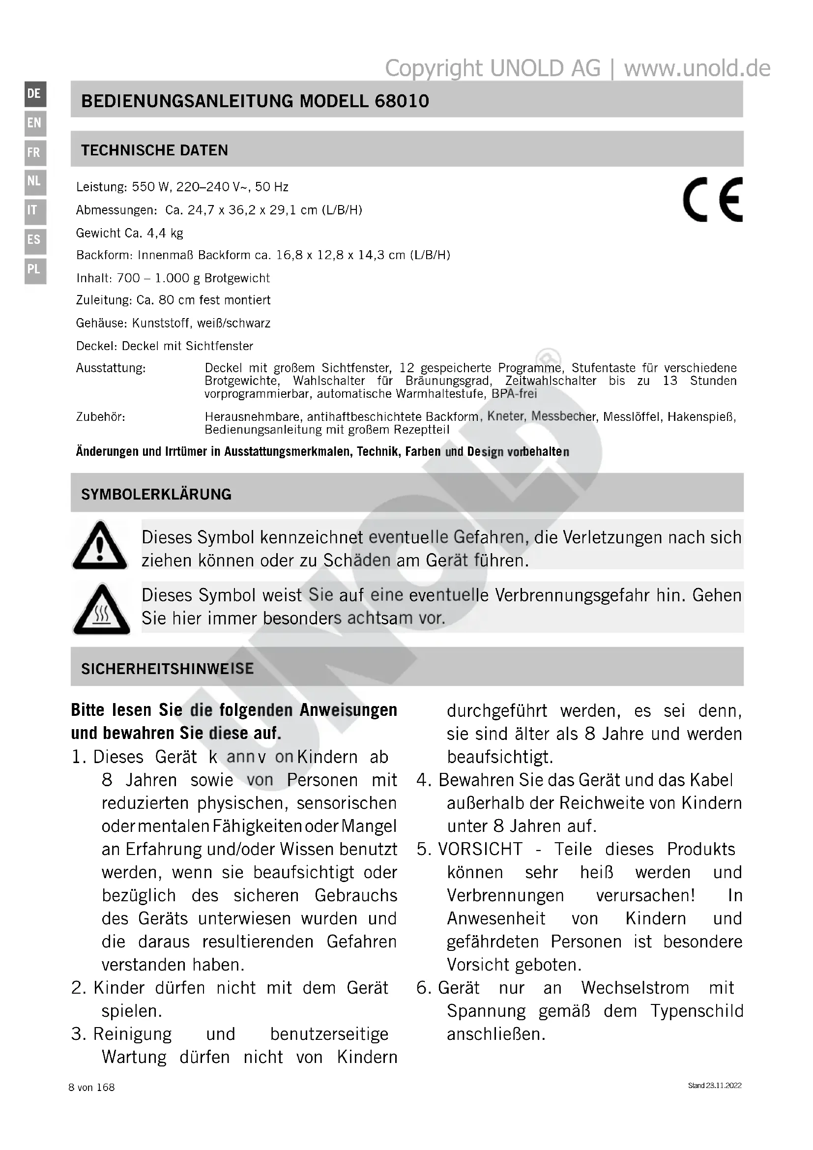 Spannung gemäß dem Typenschild anschließen. Leistung: 550 W, 220–240 V~, 50 Hz Abmessungen: Ca. 24,7 x 36,2 x 29,1 cm (L/B/H) Gewicht Ca. 4,4 kg Backform: Innenmaß Backform ca. 16,8 x 12,8 x 14,3 cm (L/B/H) Inhalt: 700 – 1.000 g Brotgewicht Zuleitung: Ca. 80 cm fest montiert Gehäuse: Kunststoff, weiß/schwarz Deckel: Deckel mit Sichtfenster Ausstattung: Deckel mit großem Sichtfenster, 12 gespeicherte Programme, Stufentaste für verschiedene Brotgewichte, Wahlschalter für Bräunungsgrad, Zeitwahlschalter bis zu 13 Stunden vorprogrammierbar, automatische Warmhaltestufe, BPA-frei Zubehör: Herausnehmbare, antihaftbeschichtete Backform, Kneter, Messbecher, Messlöffel, Hakenspieß, Bedienungsanleitung mit großem Rezeptteil Änderungen und Irrtümer in Ausstattungsmerkmalen, Technik, Farben und Design vorbehalten SYMBOLERKLÄRUNG Dieses Symbol kennzeichnet eventuelle Gefahren, die Verletzungen nach sich ziehen können oder zu Schäden am Gerät führen. Dieses Symbol weist Sie auf eine eventuelle Verbrennungsgefahr hin. Gehen Sie hier immer besonders achtsam vor. Copyright UNOLD AG | www.unold.deStand 23.11.2022 9 von 168
