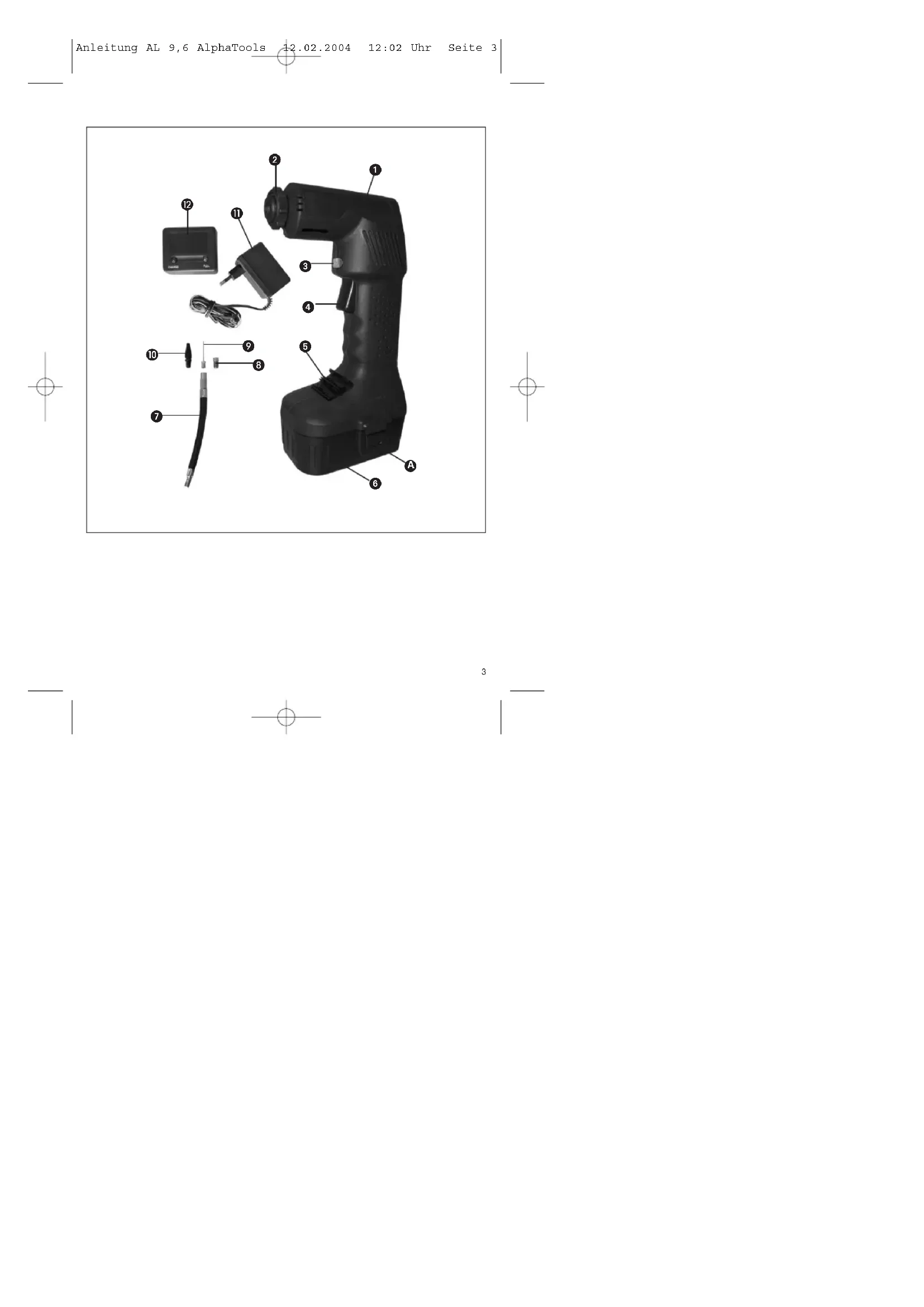 Anleitung AL 9,6 AlphaTools 12.02.2004 12:02 Uhr Seite 34 Lieferumfang: 1 Akku-Luftpumpe 1 Wechselakku 1 Ladegerät 1 Ladeadapter 1 Adapterset 3 tlg. 1 Druckschlauch Geräteabbildung: 1 Akku-Luftpumpe komplett 2 Überwurfmutter 3 Einschaltsperre 4 Ein-Ausschalter 5 Adapterhalterung 6 Akkupack 7 Druckschlauch 8 Fahrradadapter 9 Balladapter 10 Luftmatratzenadapter 11 Ladegerät 12 Ladeadapter Wichtige Hinweise: Lesen Sie vor der Inbetriebnahme unbedingt diese Hinweise:
