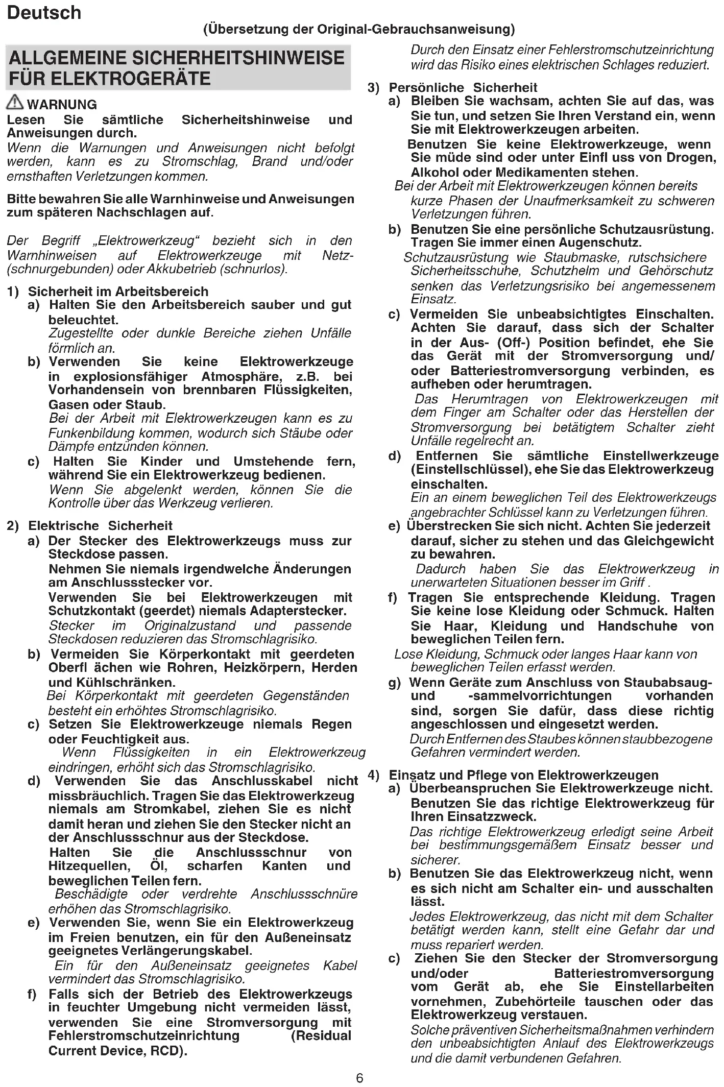 WARNUNG Lesen Sie sämtliche Sicherheitshinweise und Anweisungen durch. Wenn die Warnungen und Anweisungen nicht befolgt werden, kann es zu Stromschlag, Brand und/oder ernsthaften Verletzungen kommen. Bitte bewahren Sie alle Warnhinweise und Anweisungen zum späteren Nachschlagen auf. Der Begriff „Elektrowerkzeug“ bezieht sich in den Warnhinweisen auf Elektrowerkzeuge mit Netz- (schnurgebunden) oder Akkubetrieb (schnurlos).