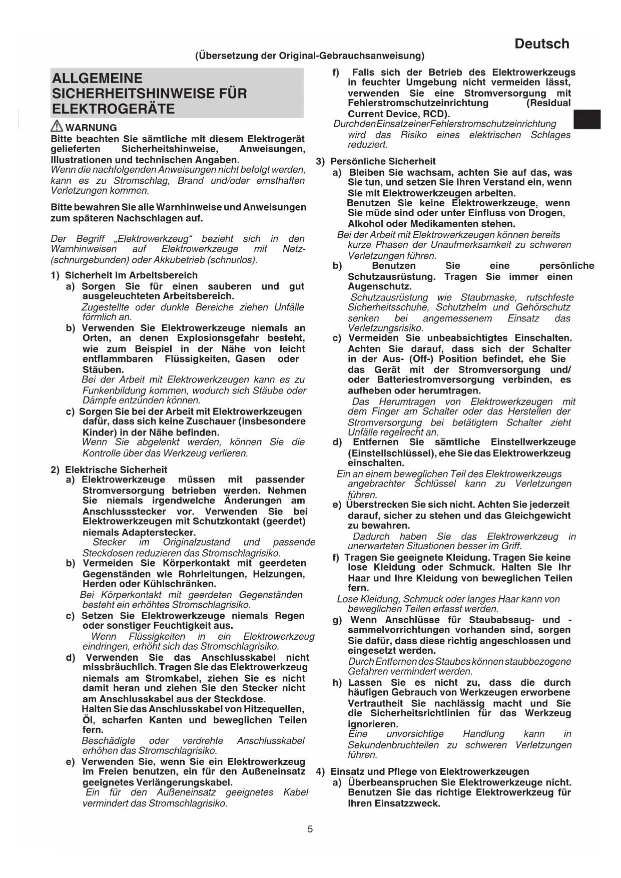 ELEKTROGERÄTE WARNUNG Bitte beachten Sie sämtliche mit diesem Elektrogerät gelieferten Sicherheitshinweise, Anweisungen, Illustrationen und technischen Angaben. Wenn die nachfolgenden Anweisungen nicht befolgt werden, kann es zu Stromschlag, Brand und/oder ernsthaften Verletzungen kommen. Bitte bewahren Sie alle Warnhinweise und Anweisungen zum späteren Nachschlagen auf. Der Begri „Elektrowerkzeug“ bezieht sich in den Warnhinweisen auf Elektrowerkzeuge mit Netz- (schnurgebunden) oder Akkubetrieb (schnurlos).