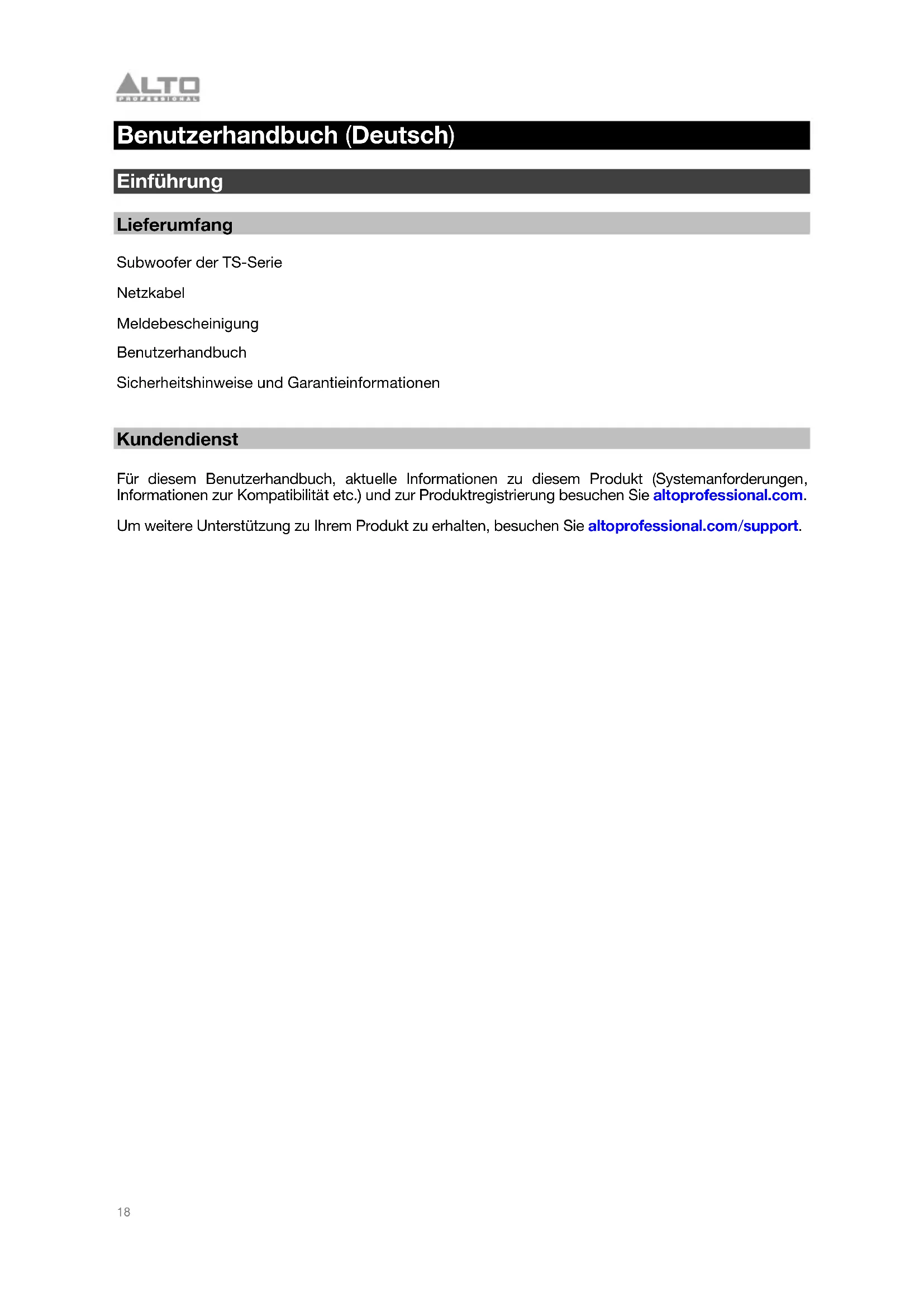Kundendienst Für diesem Benutzerhandbuch, aktuelle Informationen zu diesem Produkt (Systemanforderungen, Informationen zur Kompatibilität etc.) und zur Produktregistrierung besuchen Sie altoprofessional.com. Um weitere Unterstützung zu Ihrem Produkt zu erhalten, besuchen Sie altoprofessional.com/support.19