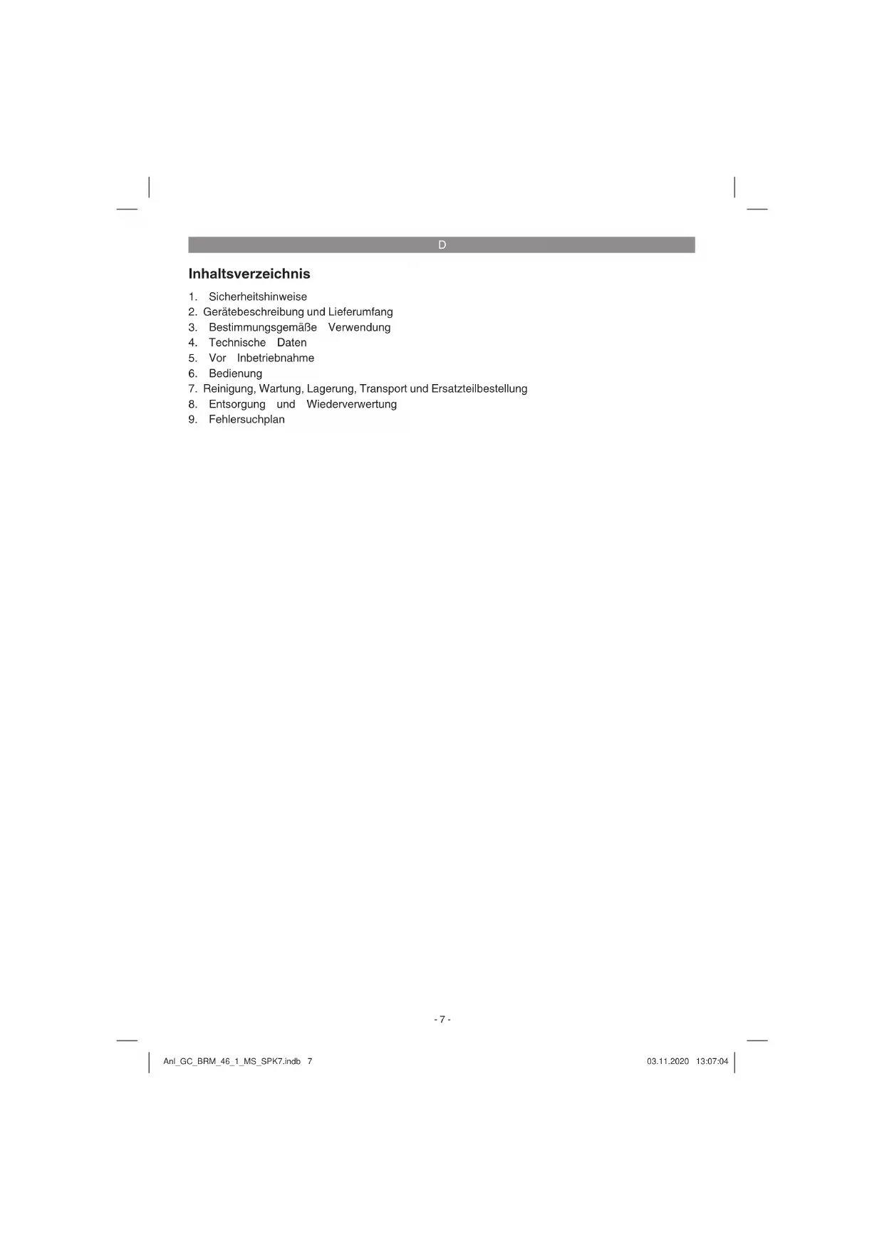 Wiederverwertung Das Gerät befi ndet sich in einer Verpackung um Transportschäden zu verhindern. Diese Verpa- ckung ist Rohstoff und ist somit wieder verwend- bar oder kann dem Rohstoff kreislauf zurückge- führt werden. Das Gerät und dessen Zubehör bestehen aus verschiedenen Materialien, wie z.B. Metall und Kunststoff e. Defekte Geräte ge- hören nicht in den Hausmüll. Zur fachgerechten Entsorgung sollte das Gerät an einer geeigneten Sammelstellen abgegeben werden. Wenn Ihnen keine Sammelstelle bekannt ist, sollten Sie bei der Gemeindeverwaltung nachfragen. Anl_GC_BRM_46_1_MS_SPK7.indb 15Anl_GC_BRM_46_1_MS_SPK7.indb 15 03.11.2020 13:07:0503.11.2020 13:07:05D