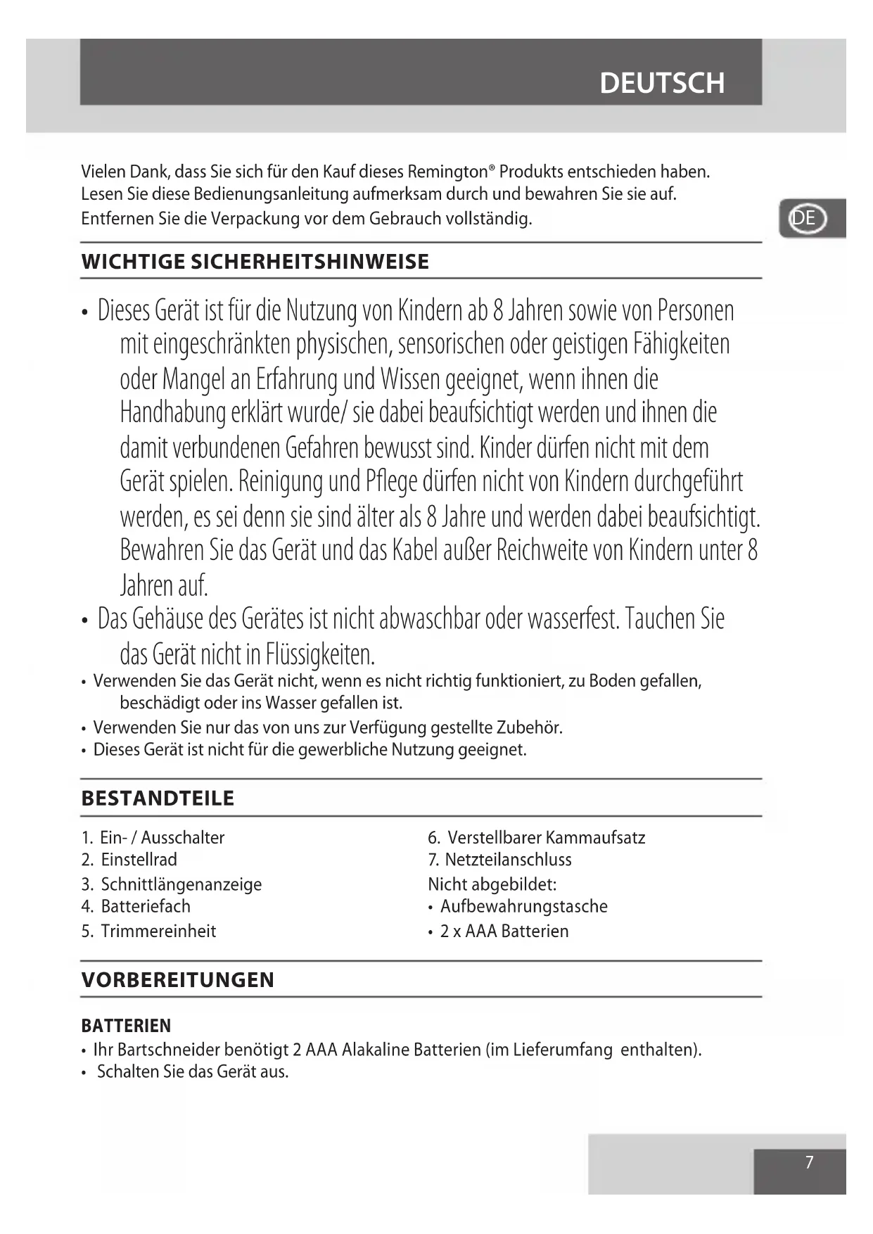 To avoid environmental and health problems due to hazardous substances, appliances and rechargeable and non-rechargeable batteries marked with one of these symbols must not be disposed of with unsorted municipal waste. Always dispose of electrical and electronic products and, where applicable, rechargeable and non-rechargeable batteries, at an appropriate ocial recycling/ collection point. ENGLISH7 Vielen Dank, dass Sie sich für den Kauf dieses Remington® Produkts entschieden haben. Lesen Sie diese Bedienungsanleitung aufmerksam durch und bewahren Sie sie auf. Entfernen Sie die Verpackung vor dem Gebrauch vollständig. WICHTIGE SICHERHEITSHINWEISE