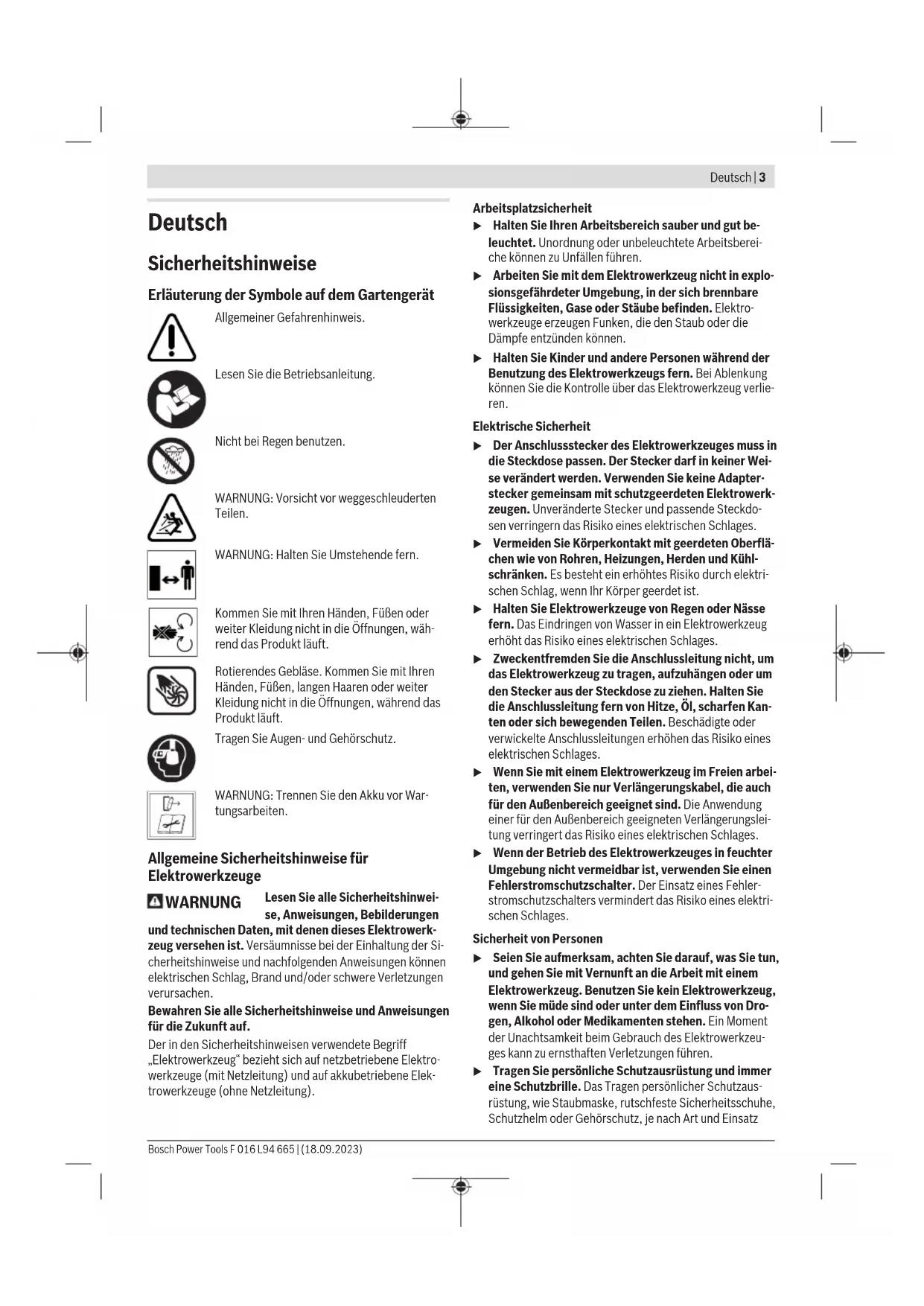F 016 L94 665 | (18.09.2023) Bosch Power ToolsDeutsch | 3 Deutsch Sicherheitshinweise Erläuterung der Symbole auf dem Gartengerät Allgemeiner Gefahrenhinweis. Lesen Sie die Betriebsanleitung. Nicht bei Regen benutzen. WARNUNG: Vorsicht vor weggeschleuderten Teilen. WARNUNG: Halten Sie Umstehende fern. Kommen Sie mit Ihren Händen, Füßen oder weiter Kleidung nicht in die Öffnungen, wäh- rend das Produkt läuft. Rotierendes Gebläse. Kommen Sie mit Ihren Händen, Füßen, langen Haaren oder weiter Kleidung nicht in die Öffnungen, während das Produkt läuft. Tragen Sie Augen- und Gehörschutz. WARNUNG: Trennen Sie den Akku vor War- tungsarbeiten. Allgemeine Sicherheitshinweise für Elektrowerkzeuge WARNUNG Lesen Sie alle Sicherheitshinwei- se, Anweisungen, Bebilderungen und technischen Daten, mit denen dieses Elektrowerk- zeug versehen ist. Versäumnisse bei der Einhaltung der Si- cherheitshinweise und nachfolgenden Anweisungen können elektrischen Schlag, Brand und/oder schwere Verletzungen verursachen. Bewahren Sie alle Sicherheitshinweise und Anweisungen für die Zukunft auf. Der in den Sicherheitshinweisen verwendete Begriff „Elektrowerkzeug“ bezieht sich auf netzbetriebene Elektro- werkzeuge (mit Netzleitung) und auf akkubetriebene Elek- trowerkzeuge (ohne Netzleitung). Arbeitsplatzsicherheit u Halten Sie Ihren Arbeitsbereich sauber und gut be- leuchtet. Unordnung oder unbeleuchtete Arbeitsberei- che können zu Unfällen führen. u Arbeiten Sie mit dem Elektrowerkzeug nicht in explo- sionsgefährdeter Umgebung, in der sich brennbare Flüssigkeiten, Gase oder Stäube befinden. Elektro- werkzeuge erzeugen Funken, die den Staub oder die Dämpfe entzünden können. u Halten Sie Kinder und andere Personen während der Benutzung des Elektrowerkzeugs fern. Bei Ablenkung können Sie die Kontrolle über das Elektrowerkzeug verlie- ren. Elektrische Sicherheit u Der Anschlussstecker des Elektrowerkzeuges muss in die Steckdose passen. Der Stecker darf in keiner Wei- se verändert werden. Verwenden Sie keine Adapter- stecker gemeinsam mit schutzgeerdeten Elektrowerk- zeugen. Unveränderte Stecker und passende Steckdo- sen verringern das Risiko eines elektrischen Schlages. u Vermeiden Sie Körperkontakt mit geerdeten Oberflä- chen wie von Rohren, Heizungen, Herden und Kühl- schränken. Es besteht ein erhöhtes Risiko durch elektri- schen Schlag, wenn Ihr Körper geerdet ist. u Halten Sie Elektrowerkzeuge von Regen oder Nässe fern. Das Eindringen von Wasser in ein Elektrowerkzeug erhöht das Risiko eines elektrischen Schlages. u Zweckentfremden Sie die Anschlussleitung nicht, um das Elektrowerkzeug zu tragen, aufzuhängen oder um den Stecker aus der Steckdose zu ziehen. Halten Sie die Anschlussleitung fern von Hitze, Öl, scharfen Kan- ten oder sich bewegenden Teilen. Beschädigte oder verwickelte Anschlussleitungen erhöhen das Risiko eines elektrischen Schlages. u Wenn Sie mit einem Elektrowerkzeug im Freien arbei- ten, verwenden Sie nur Verlängerungskabel, die auch für den Außenbereich geeignet sind. Die Anwendung einer für den Außenbereich geeigneten Verlängerungslei- tung verringert das Risiko eines elektrischen Schlages. u Wenn der Betrieb des Elektrowerkzeuges in feuchter Umgebung nicht vermeidbar ist, verwenden Sie einen Fehlerstromschutzschalter. Der Einsatz eines Fehler- stromschutzschalters vermindert das Risiko eines elektri- schen Schlages. Sicherheit von Personen u Seien Sie aufmerksam, achten Sie darauf, was Sie tun, und gehen Sie mit Vernunft an die Arbeit mit einem Elektrowerkzeug. Benutzen Sie kein Elektrowerkzeug, wenn Sie müde sind oder unter dem Einfluss von Dro- gen, Alkohol oder Medikamenten stehen. Ein Moment der Unachtsamkeit beim Gebrauch des Elektrowerkzeu- ges kann zu ernsthaften Verletzungen führen. u Tragen Sie persönliche Schutzausrüstung und immer eine Schutzbrille. Das Tragen persönlicher Schutzaus- rüstung, wie Staubmaske, rutschfeste Sicherheitsschuhe, Schutzhelm oder Gehörschutz, je nach Art und Einsatz Bosch Power Tools F 016 L94 665 | (18.09.2023)4 | Deutsch des Elektrowerkzeuges, verringert das Risiko von Verlet- zungen. u Vermeiden Sie eine unbeabsichtigte Inbetriebnahme. Vergewissern Sie sich, dass das Elektrowerkzeug aus- geschaltet ist, bevor Sie es an die Stromversorgung und/oder den Akku anschließen, es aufnehmen oder tragen. Wenn Sie beim Tragen des Elektrowerkzeuges den Finger am Schalter haben oder das Gerät eingeschal- tet an die Stromversorgung anschließen, kann dies zu Un- fällen führen. u Entfernen Sie Einstellwerkzeuge oder Schrauben- schlüssel, bevor Sie das Elektrowerkzeug einschalten. Ein Werkzeug oder Schlüssel, der sich in einem drehen- den Geräteteil befindet, kann zu Verletzungen führen. u Vermeiden Sie eine abnormale Körperhaltung. Sorgen Sie für einen sicheren Stand und halten Sie jederzeit das Gleichgewicht. Dadurch können Sie das Elektro- werkzeug in unerwarteten Situationen besser kontrollie- ren. u Tragen Sie geeignete Kleidung. Tragen Sie keine weite Kleidung oder Schmuck. Halten Sie Haare und Klei- dung fern von sich bewegenden Teilen. Lockere Klei- dung, Schmuck oder lange Haare können von sich bewe- genden Teilen erfasst werden. u Wenn Staubabsaug- und -auffangeinrichtungen mon- tiert werden können, sind diese anzuschließen und richtig zu verwenden. Verwendung einer Staubabsau- gung kann Gefährdungen durch Staub verringern. u Wiegen Sie sich nicht in falscher Sicherheit und set- zen Sie sich nicht über die Sicherheitsregeln für Elek- trowerkzeuge hinweg, auch wenn Sie nach vielfachem Gebrauch mit dem Elektrowerkzeug vertraut sind. Achtloses Handeln kann binnen Sekundenbruchteilen zu schweren Verletzungen führen. Verwendung und Behandlung des Elektrowerkzeugs u Überlasten Sie das Elektrowerkzeug nicht. Verwenden Sie für Ihre Arbeit das dafür bestimmte Elektrowerk- zeug. Mit dem passenden Elektrowerkzeug arbeiten Sie besser und sicherer im angegebenen Leistungsbereich. u Benutzen Sie 