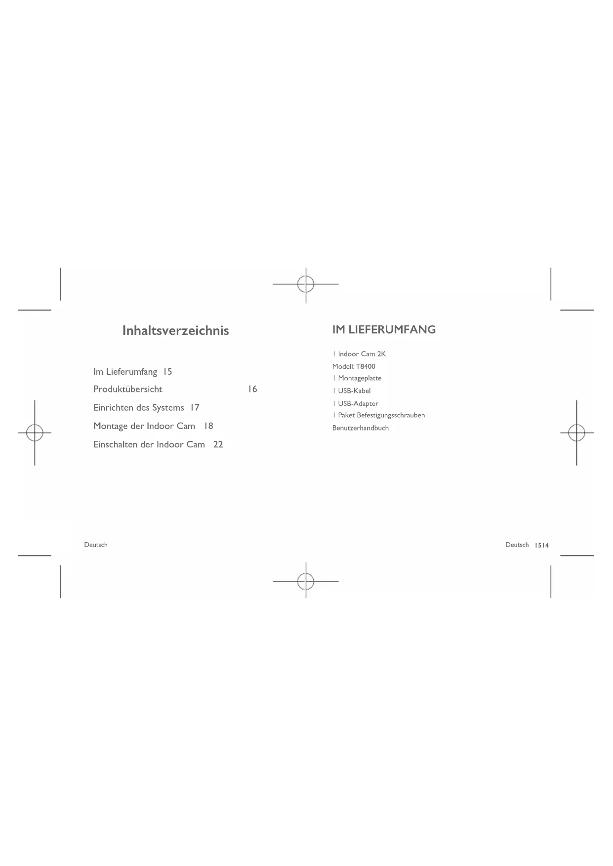 Deutsch Inhaltsverzeichnis Im Lieferumfang 15 Produktübersicht 16 Einrichten des Systems 17 Montage der Indoor Cam 18 Einschalten der Indoor Cam 22 IM LIEFERUMFANG 1 Indoor Cam 2K Modell: T8400 1 Montageplatte 1 USB-Kabel 1 USB-Adapter 1 Paket Befestigungsschrauben BenutzerhandbuchDeutsch