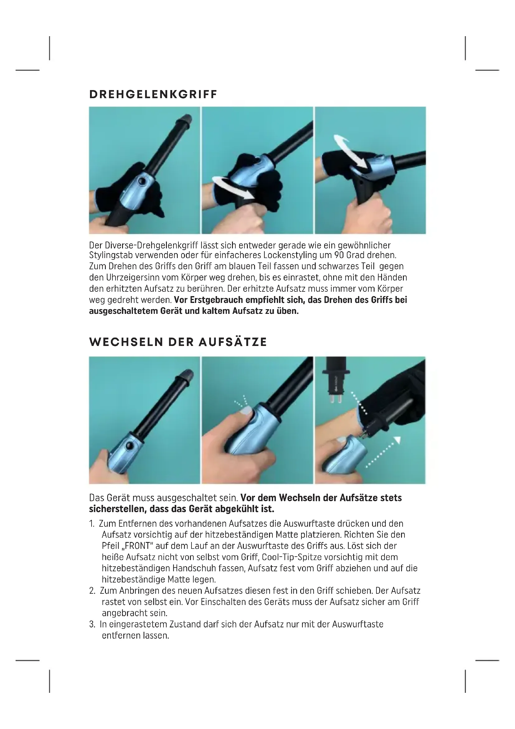 Das Gerät muss ausgeschaltet sein. Vor dem Wechseln der Aufsätze stets sicherstellen, dass das Gerät abgekühlt ist.