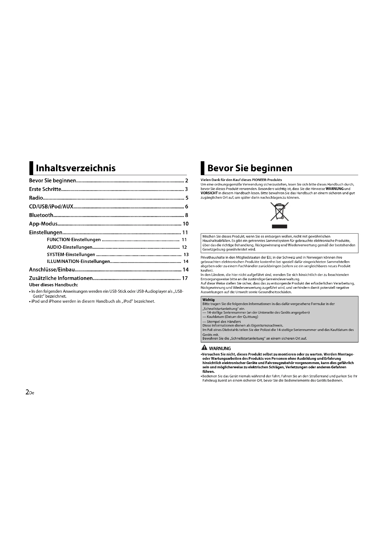 - iPod und iPhone werden in diesem Handbuch als „iPod” bezeichnet. Inhaltsverzeichnis Vielen Dank für den Kauf dieses PIONEER-ProduktsUm eine ordnungsgemäße Verwendung sicherzustellen, lesen Sie sich bitte dieses Handbuch durch, bevor Sie dieses Produkt verwenden. Besonders wichtig ist, dass Sie die Hinweise WARNUNG und VORSICHT in diesem Handbuch lesen. Bitte bewahren Sie das Handbuch an einem sicheren und gut zugänglichen Ort auf, um später darin nachschlagen zu können.Privathaushalte in den Mitgliedstaaten der EU, in der Schweiz und in Norwegen können ihre gebrauchten elektronischen Produkte kostenfrei bei speziell dafür eingerichteten Sammelstellen abgeben oder zu einem Fachhändler zurückbringen (sofern sie ein vergleichbares neues Produkt kaufen).In den Ländern, die hier nicht aufgeführt sind, wenden Sie sich hinsichtlich der zu beachtenden Entsorgungsweise bitte an die zuständige Gemeindeverwaltung.Auf diese Weise stellen Sie sicher, dass das zu entsorgende Produkt der erforderlichen Verarbeitung, Rückgewinnung und Wiederverwertung zugeführt wird, und verhindern damit potenziell negative Auswirkungen auf die Umwelt sowie Gesundheitsschäden. WARNUNG