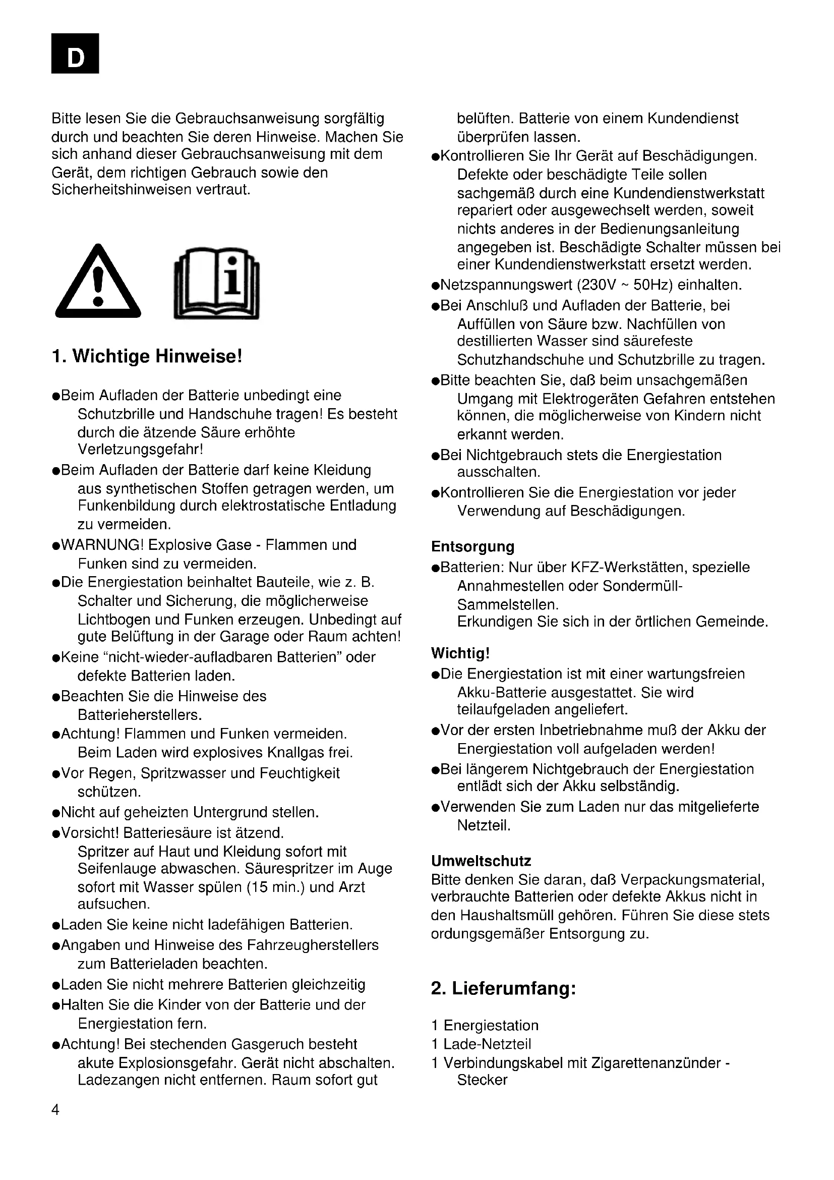 Beim Aufladen der Batterie unbedingt eine Schutzbrille und Handschuhe tragen! Es besteht durch die ätzende Säure erhöhte Verletzungsgefahr! Beim Aufladen der Batterie darf keine Kleidung aus synthetischen Stoffen getragen werden, um Funkenbildung durch elektrostatische Entladung zu vermeiden. WARNUNG! Explosive Gase - Flammen und Funken sind zu vermeiden. Die Energiestation beinhaltet Bauteile, wie z. B. Schalter und Sicherung, die möglicherweise Lichtbogen und Funken erzeugen. Unbedingt auf gute Belüftung in der Garage oder Raum achten! Keine “nicht-wieder-aufladbaren Batterien” oder defekte Batterien laden. Beachten Sie die Hinweise des Batterieherstellers. Achtung! Flammen und Funken vermeiden. Beim Laden wird explosives Knallgas frei. Vor Regen, Spritzwasser und Feuchtigkeit schützen. Nicht auf geheizten Untergrund stellen. Vorsicht! Batteriesäure ist ätzend. Spritzer auf Haut und Kleidung sofort mit Seifenlauge abwaschen. Säurespritzer im Auge sofort mit Wasser spülen (15 min.) und Arzt aufsuchen. Laden Sie keine nicht ladefähigen Batterien. Angaben und Hinweise des Fahrzeugherstellers zum Batterieladen beachten. Laden Sie nicht mehrere Batterien gleichzeitig Halten Sie die Kinder von der Batterie und der Energiestation fern. Achtung! Bei stechenden Gasgeruch besteht akute Explosionsgefahr. Gerät nicht abschalten. Ladezangen nicht entfernen. Raum sofort gut belüften. Batterie von einem Kundendienst überprüfen lassen. Kontrollieren Sie Ihr Gerät auf Beschädigungen. Defekte oder beschädigte Teile sollen sachgemäß durch eine Kundendienstwerkstatt repariert oder ausgewechselt werden, soweit nichts anderes in der Bedienungsanleitung angegeben ist. Beschädigte Schalter müssen bei einer Kundendienstwerkstatt ersetzt werden. Netzspannungswert (230V ~ 50Hz) einhalten. Bei Anschluß und Aufladen der Batterie, bei Auffüllen von Säure bzw. Nachfüllen von destillierten Wasser sind säurefeste Schutzhandschuhe und Schutzbrille zu tragen. Bitte beachten Sie, daß beim unsachgemäßen Umgang mit Elektrogeräten Gefahren entstehen können, die möglicherweise von Kindern nicht erkannt werden. Bei Nichtgebrauch stets die Energiestation ausschalten. Kontrollieren Sie die Energiestation vor jeder Verwendung auf Beschädigungen. Entsorgung Batterien: Nur über KFZ-Werkstätten, spezielle Annahmestellen oder Sondermüll- Sammelstellen. Erkundigen Sie sich in der örtlichen Gemeinde. Wichtig! Die Energiestation ist mit einer wartungsfreien Akku-Batterie ausgestattet. Sie wird teilaufgeladen angeliefert. Vor der ersten Inbetriebnahme muß der Akku der Energiestation voll aufgeladen werden! Bei längerem Nichtgebrauch der Energiestation entlädt sich der Akku selbständig. Verwenden Sie zum Laden nur das mitgelieferte Netzteil. Umweltschutz Bitte denken Sie daran, daß Verpackungsmaterial, verbrauchte Batterien oder defekte Akkus nicht in den Haushaltsmüll gehören. Führen Sie diese stets ordungsgemäßer Entsorgung zu.
