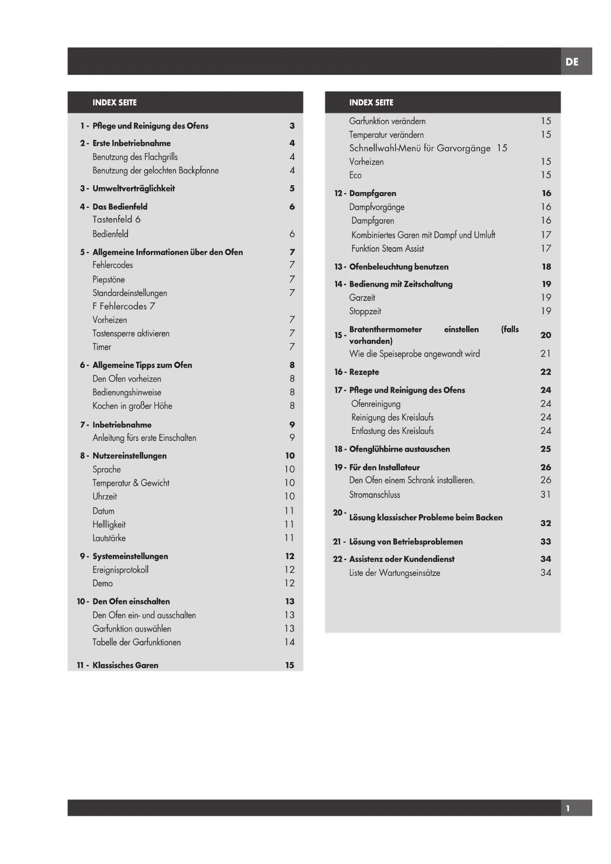 Sowie beim Backen als auch beim Backen mit Umluft können aus vielerlei Gründen, außer einer Fehlfunktion des Ofens, schlechte Ergebnisse erzielt werden. Überprüfen Sie die unten aufgeführte Grafik, in der die Ursachen der meisten Probleme aufgeführt sind. Da Größe, Form und Material der Backutensilien die Ergebnisse des Backens direkt beeinflussen, könnte es das Beste sein, alte Backutensilien, die dunkel geworden sind und sich mit dem Alter verzogen haben, auszutauschen. Problem beim Backen Ursachen Die Speisen bräunen ungleichmäßig - Ofen nicht vorgeheizt - Alufolie auf Gitterrost oder Ofenboden - Backform zu groß für das Rezept - Formen berühren sich untereinander oder die Ofenwände Speisen am Boden zu sehr gebräunt - Ofen nicht vorgeheizt - Verwendung von Glas, stumpfen oder dunkel gewordenen Metallbehältern - Gitterrost in falscher Position - Formen berühren sich untereinander oder die Ofenwände Speisen sind trocken oder zu sehr geschrumpft - Ofentemperatur zu niedrig - Ofen nicht vorgeheizt - Ofentür öfters geöffnet - Fest mit Alufolie verschlossen - Backform zu klein Speisen backen oder braten zu langsam - Ofentemperatur zu niedrig - Ofen nicht vorgeheizt - Ofentür öfters geöffnet - Fest mit Alufolie verschlossen - Backform zu klein Die Kruste von Pasteten bräunen am Boden nicht oder haben eine feuchte Kruste - Backzeit nicht lang genug - Es werden glänzende Stahltöpfe verwendet - Gitterrost in falscher Position - Ofentemperatur zu niedrig Kuchen sind blass und niedrig, sie sind innen nicht gebacken - Ofentemperatur zu niedrig - Backzeit nicht korrekt - Kuchen zu früh probiert - Ofentür zu oft geöffnet - Backform zu groß Kuchen sind in der Mitte hoch und oben gerissen - Ofentemperatur zu hoch - Backzeit zu lang - Formen berühren sich untereinander oder die Ofenwände - Gitterrost in falscher Position - Backform zu klein Der Rand der Pastetenkruste sind zu braun - Ofentemperatur zu hoch - Krustenränder zu dünnDE