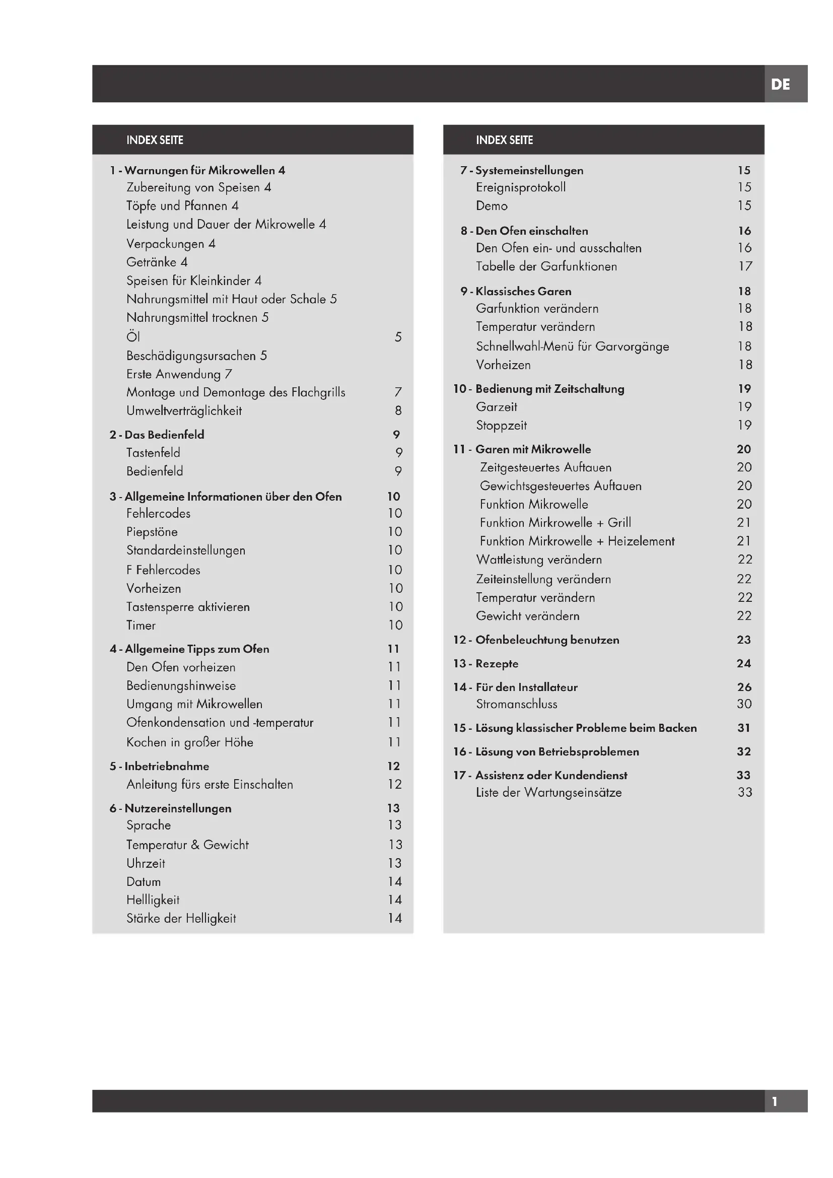 Zubereitung von Speisen 4 Töpfe und Pfannen 4 Leistung und Dauer der Mikrowelle 4 Verpackungen 4 Getränke 4 Speisen für Kleinkinder 4 Nahrungsmittel mit Haut oder Schale 5 Nahrungsmittel trocknen 5 Öl 5 Beschädigungsursachen 5 Erste Anwendung 7 Montage und Demontage des Flachgrills 7 Umweltverträglichkeit 8