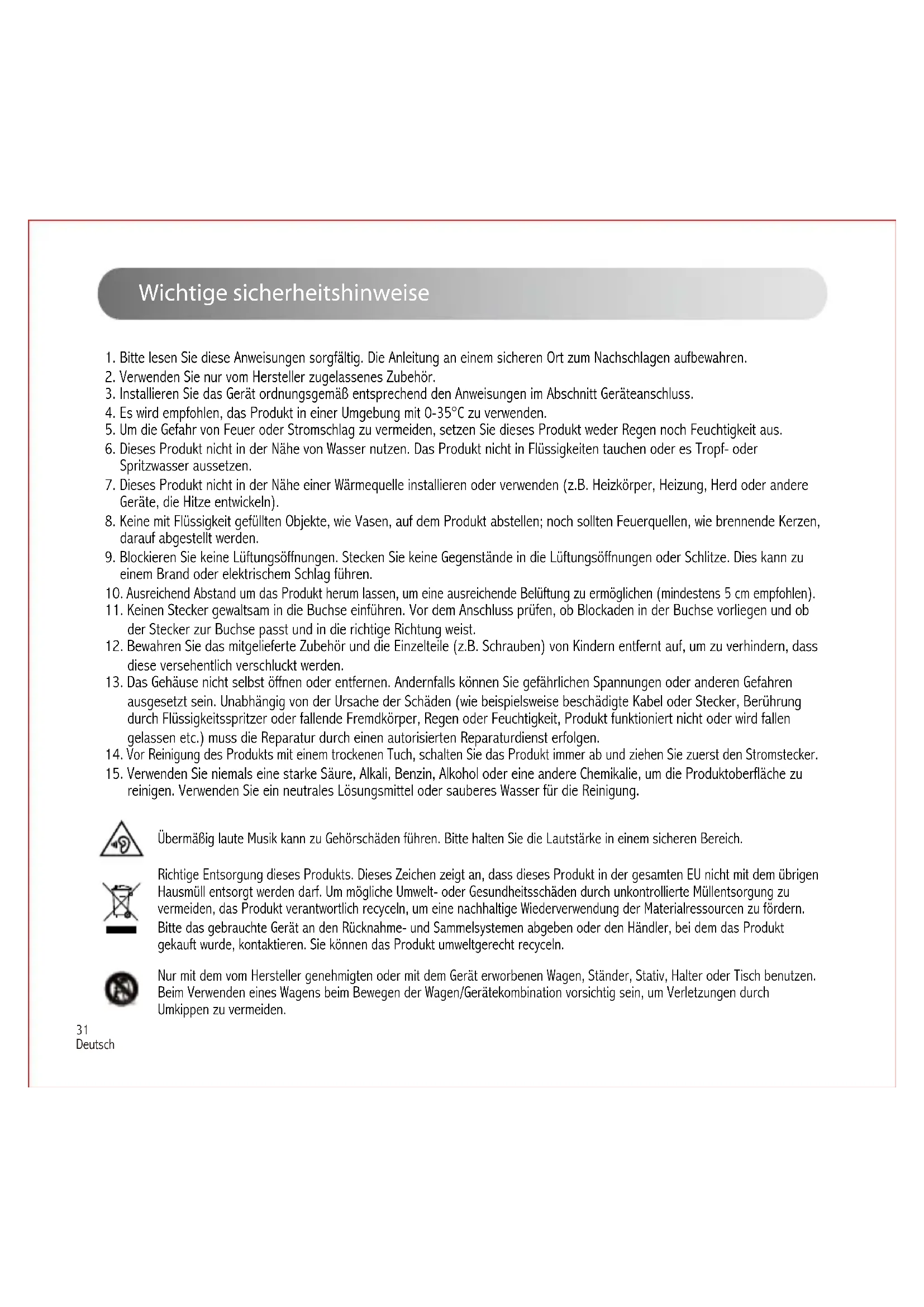 - Los altavoces EDIFIER generan el menor ruido posible, mientras que otros dispositivos de audio emiten demasiado ruido de fondo. Desconecte los cables de audio y suba el volumen, si no se oye ningún sonido a un metro de distancia del altavoz, el aparato funciona correctamente. Si quiere saber más sobre EDIFIER, visite www.edifier.com. Para consultas sobre la garantía EDIFIER, por favor, seleccione la página del país correspondiente en www.edifier.com y revise la sección Condiciones de la garantía. EE.UU. y Canadá: service@edifier.ca América del Sur: por favor, visite www.edifier.com (inglés) o www.edifierla.com (español/portugués) para obtener información de contacto local.31 Deutsch Wichtige sicherheitshinweise Übermäßig laute Musik kann zu Gehörschäden führen. Bitte halten Sie die Lautstärke in einem sicheren Bereich. Richtige Entsorgung dieses Produkts. Dieses Zeichen zeigt an, dass dieses Produkt in der gesamten EU nicht mit dem übrigen Hausmüll entsorgt werden darf. Um mögliche Umwelt- oder Gesundheitsschäden durch unkontrollierte Müllentsorgung zu vermeiden, das Produkt verantwortlich recyceln, um eine nachhaltige Wiederverwendung der Materialressourcen zu fördern. Bitte das gebrauchte Gerät an den Rücknahme- und Sammelsystemen abgeben oder den Händler, bei dem das Produkt gekauft wurde, kontaktieren. Sie können das Produkt umweltgerecht recyceln. Nur mit dem vom Hersteller genehmigten oder mit dem Gerät erworbenen Wagen, Ständer, Stativ, Halter oder Tisch benutzen. Beim Verwenden eines Wagens beim Bewegen der Wagen/Gerätekombination vorsichtig sein, um Verletzungen durch Umkippen zu vermeiden.