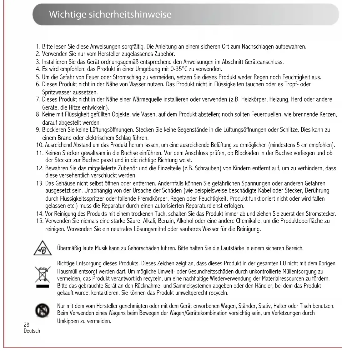 5. Um die Gefahr von Feuer oder Stromschlag zu vermeiden, setzen Sie dieses Produkt weder Regen noch Feuchtigkeit aus.